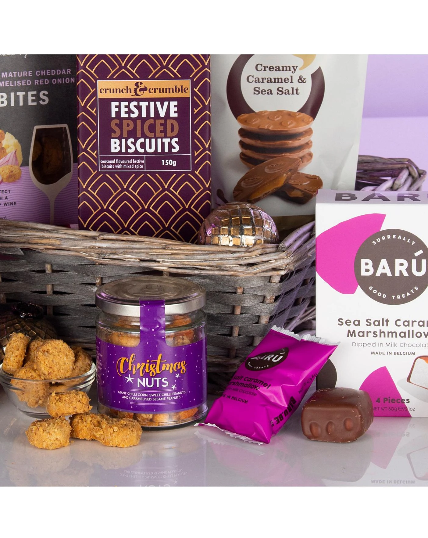 Contents: Baru Milk Chocolate & Sea Salt Caramel Marshmallows 60g, Cambrook Christmas Nuts 75g, Crunch & Crumble Festive Spiced Biscuits 150g, Dean’s Extra Mature Cheddar and Caramelised Red Onion Bites 90g, Kingsdown Blackcurrant Sparkle 750ml, Lily O’Briens Creamy Caramel & Sea Salt Chocolates 120g, Maxwell & Franks Alcohol Free Christmas Pudding 350g, Grey Willow Tray.