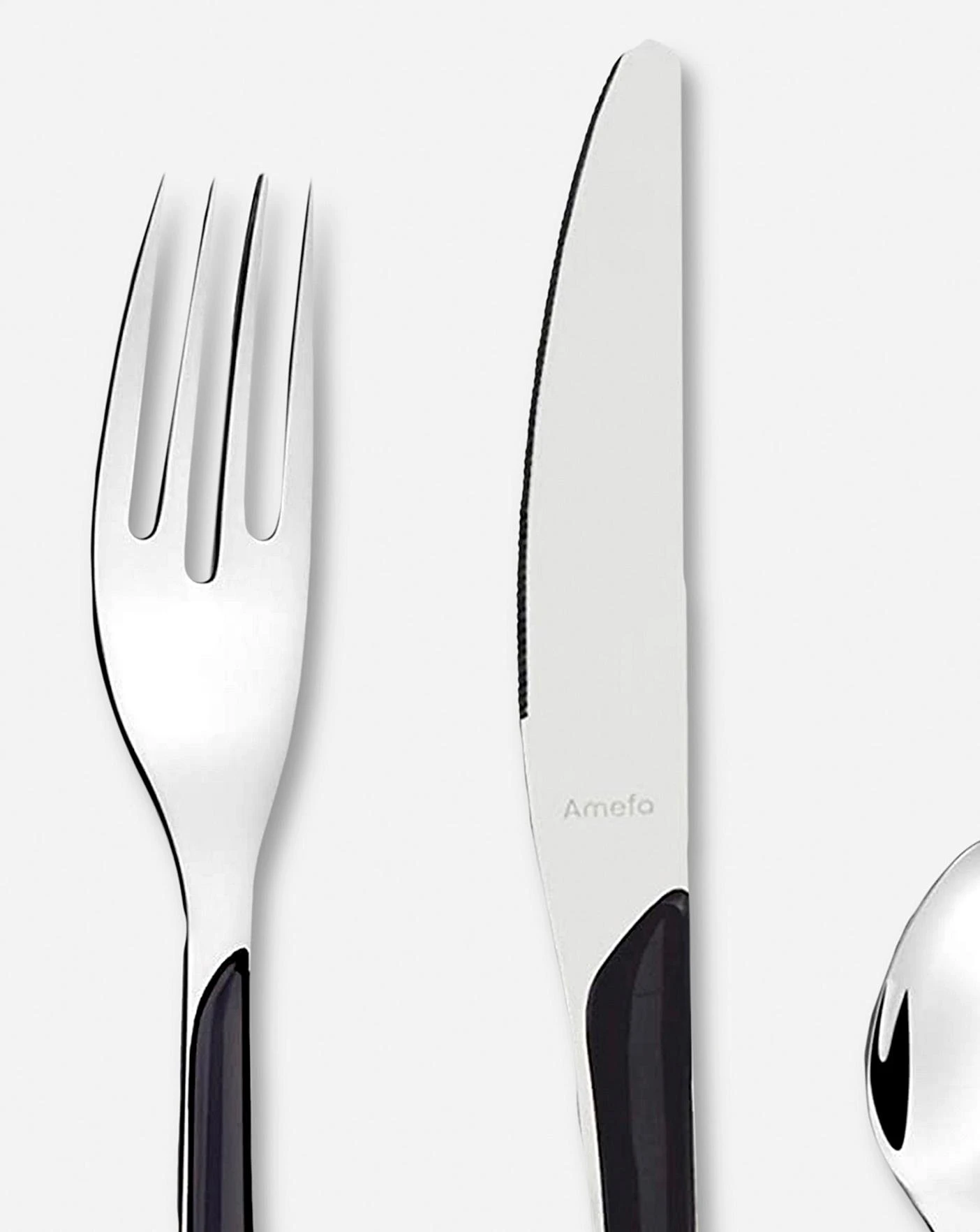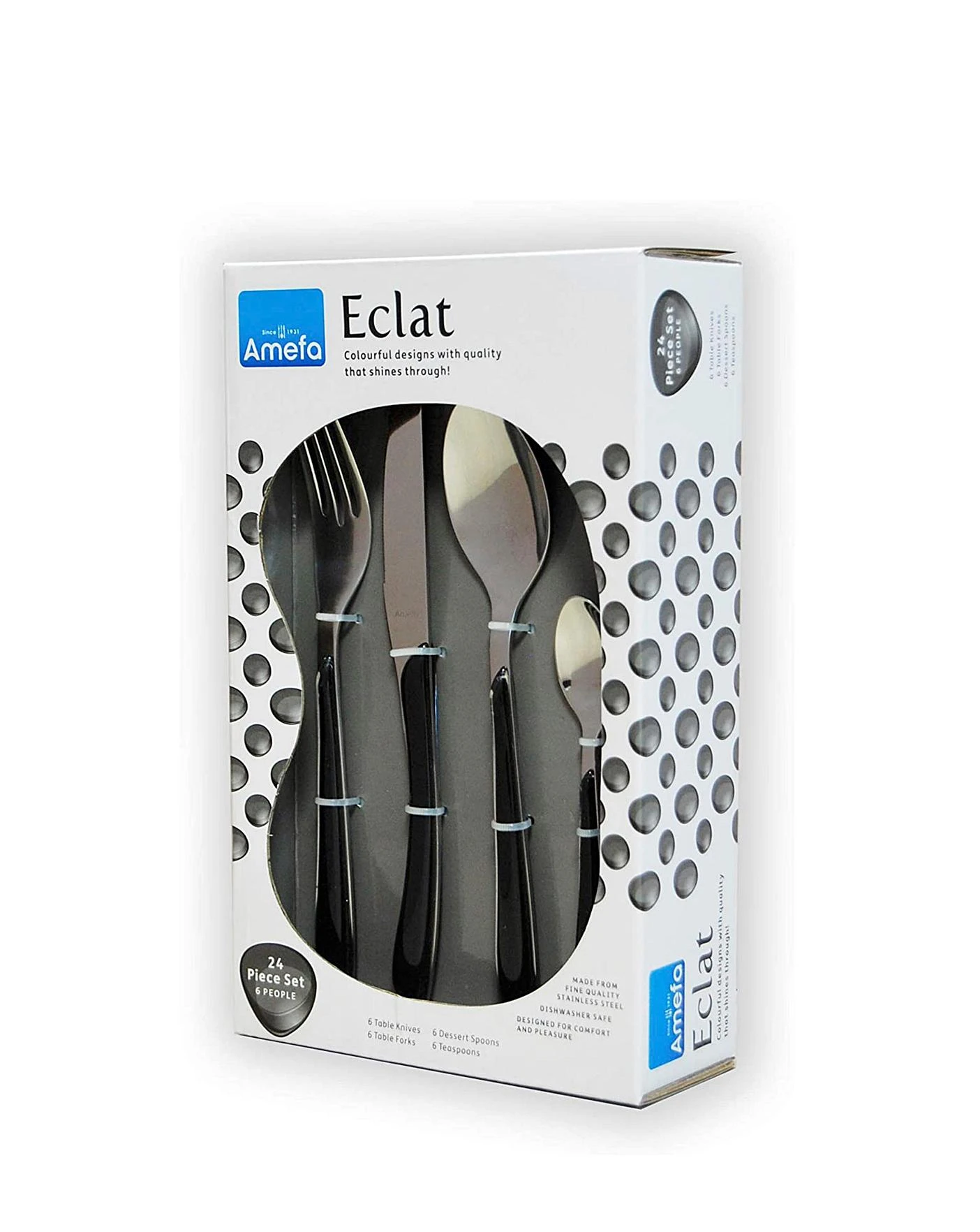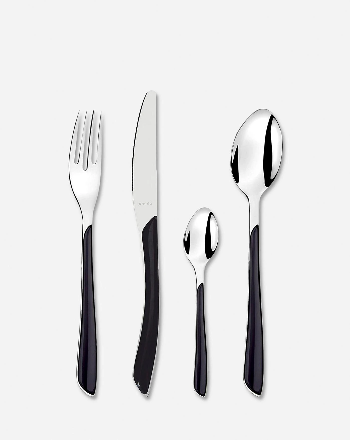 Even monochrome can be fun with Eclat. The glossy black handles are perfect in contemporary kitchens and lend a flair to even the most minimal of homes. Fine Quality Stainless Steel 18/0 Stainless Steel that has been polished for a brilliant shine. All cutlery knives are made from 13/0 stainless steel. 25 Year Guarantee-We’ve tested hundreds of knives, forks and spoons so you don’t have to. Each piece has a tick for durability, performance and lasting style. If there’s a fault with our workmanship or materials during this guarantee period, we promise to repair or replace it free of charge.