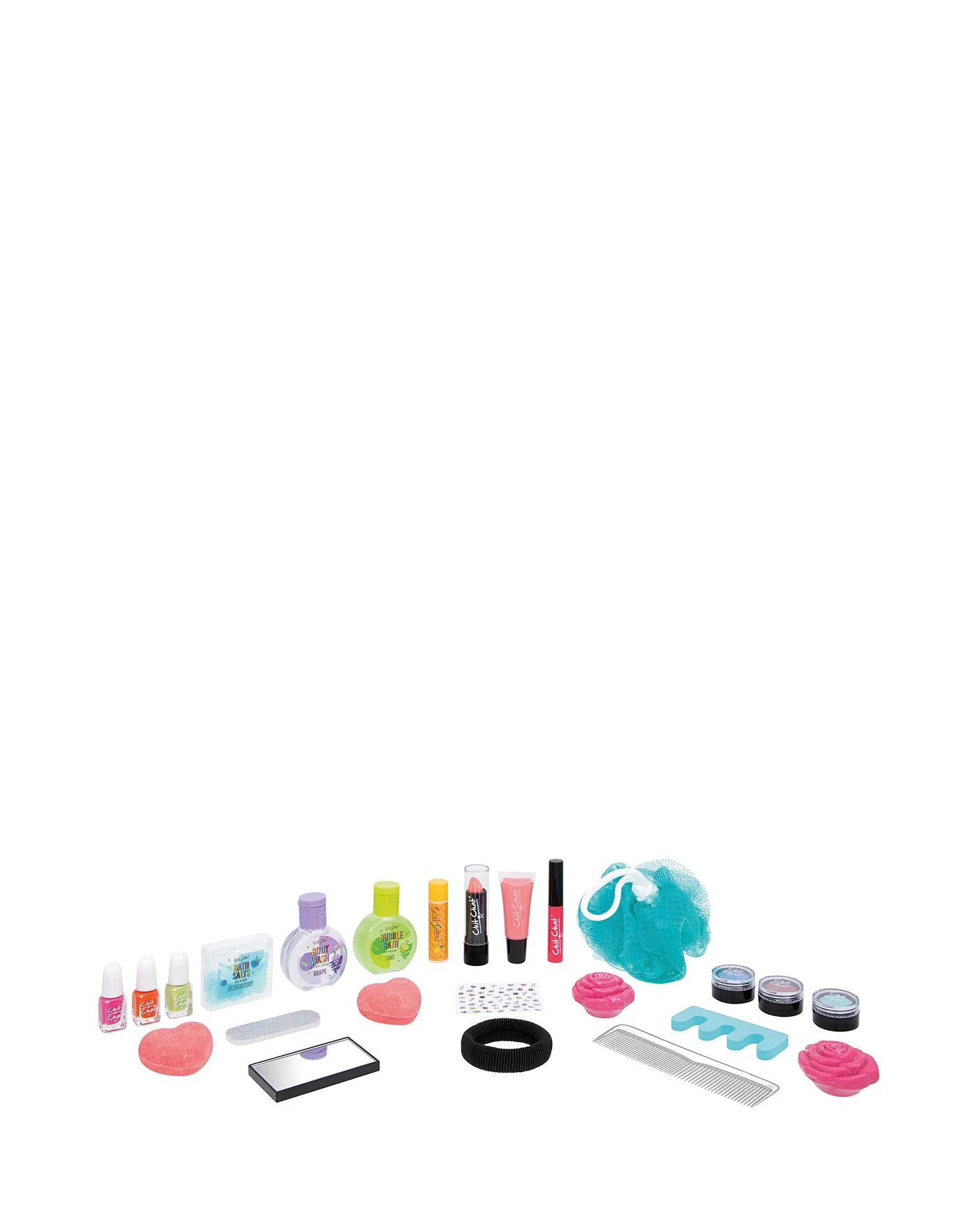 3 x Nail Polishes 3 x Single Eyeshadows 1 x Lipstick 1 x Lipgloss Wand 1 x Lipgloss Tube 1 x Lipbalm 1 x Glitter Nail File 1 x Nail Stickers 1 x Toe Separator 1 x Mirror 1 x Hair Band 1 x Comb 1 x Body Wash 1 x Bubble Bath 2 x Flower Soaps 2 x Heart Bath Fizzers 1 x Bath Salts 1 x Body Sponge