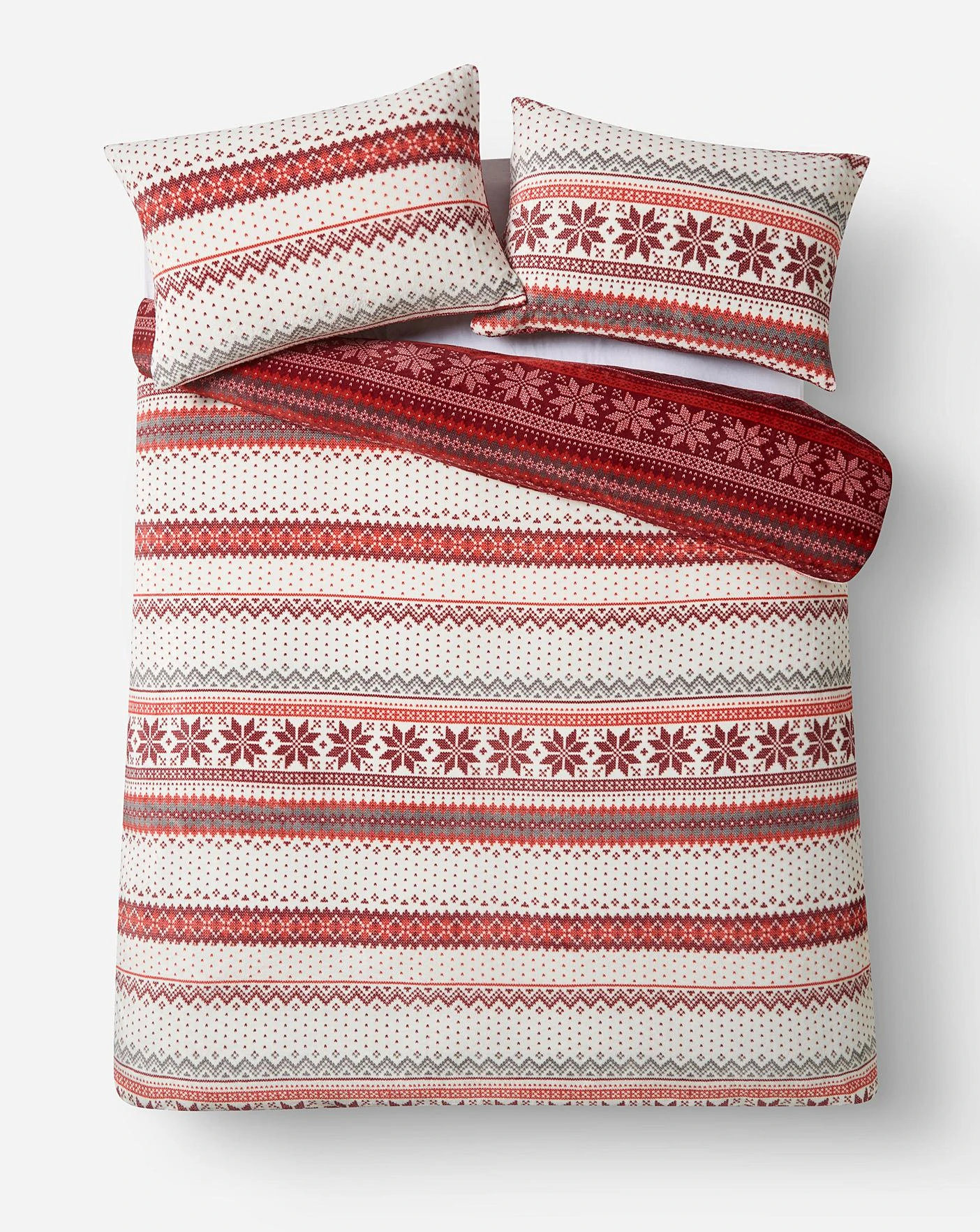 The Fairisle Fleece bedding set features a repeat fairisle print with a contrast reverse. The set includes 2x pillowcases (1x single), 1x duvet cover.