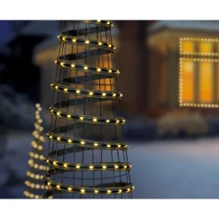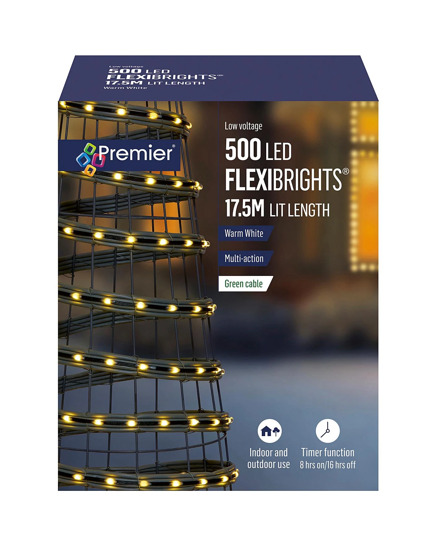 500 warm white LED Flexibrights on green cablewith a flat flexible wire that allows easy use. Timer function that switches on for 8 for hours and off for 16 hours. Multi-action with 8 lighting effects including static and a memory chip. Suitable for use indoors or outdoors. 1 year manufacturer guarantee.
