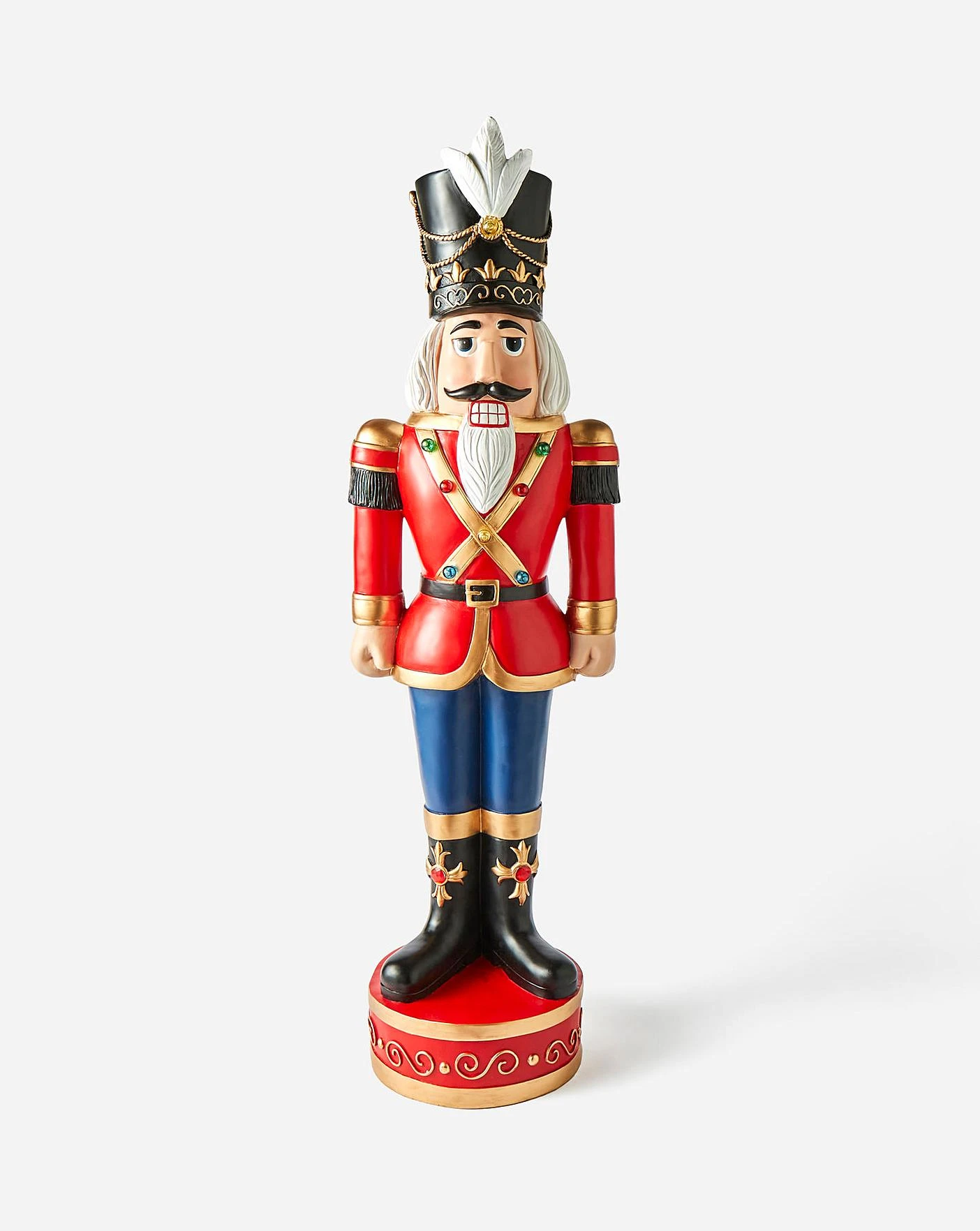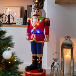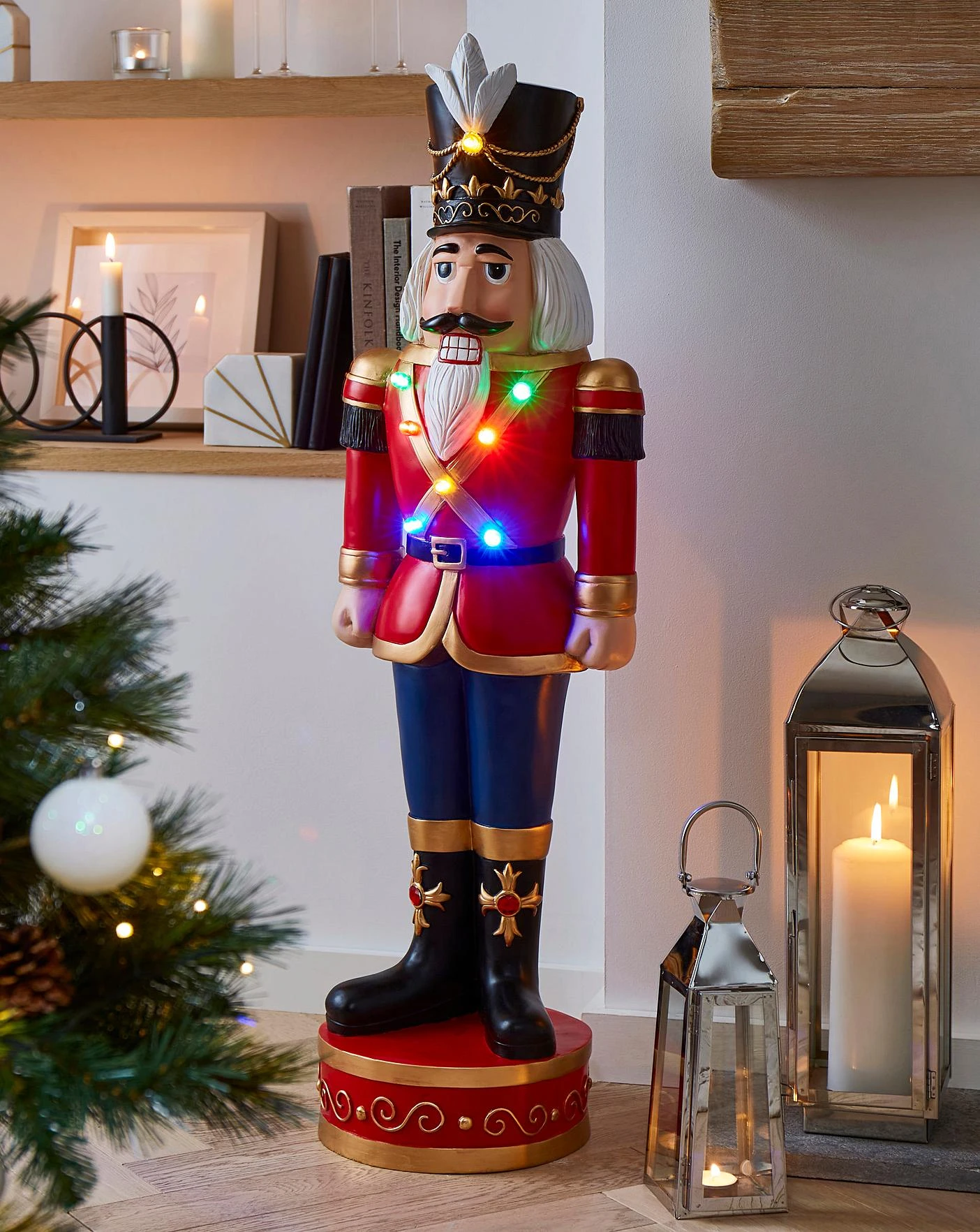 Giant Lit Nutcracker is LED operated and requires X3 AA batteries which are not included. This is made from polyresin, PVC, mild steel and acrylic. This is for indoor use only. Wipe clean using a soft dry cloth.