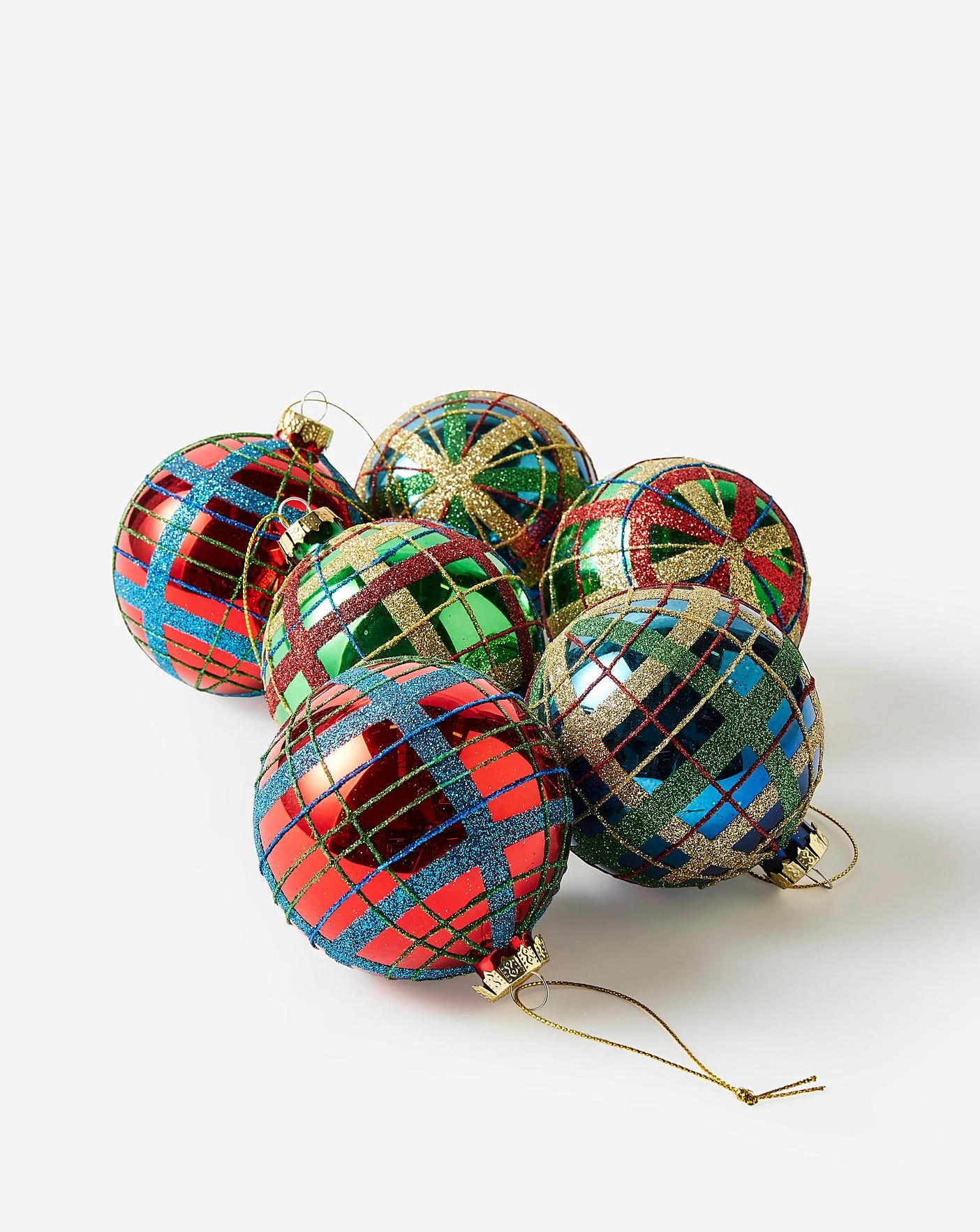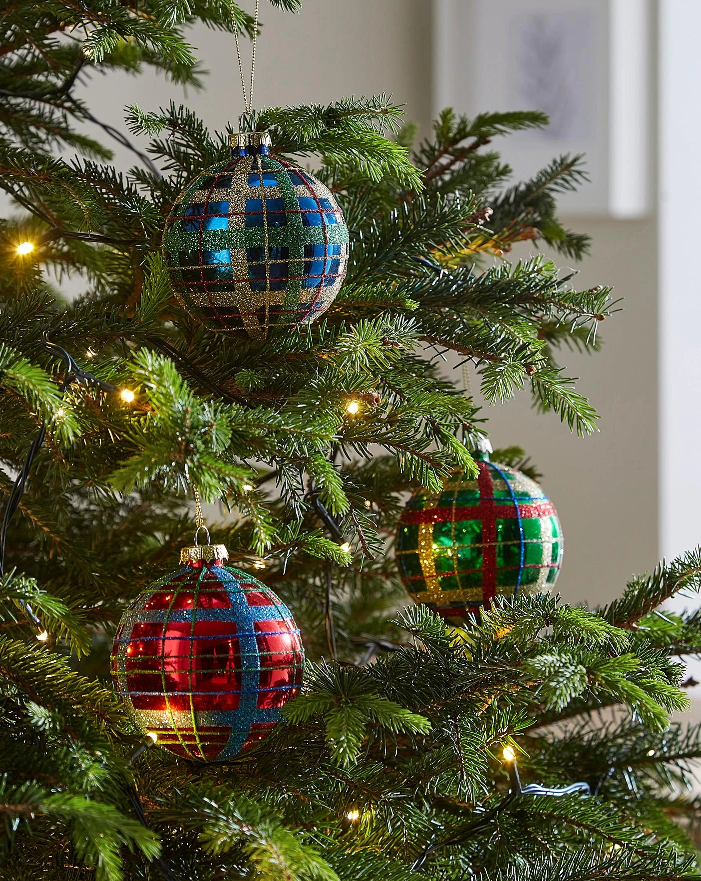 Set of 6 glass tartan baubles in contrasting green, red and blue colourways. This set is made from glass and for indoor use only. Wipe clean with a soft dry cloth.
