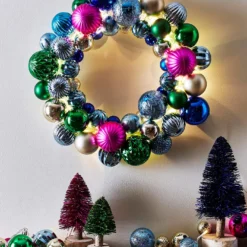 Multicolour Lit Bauble Wreath is made from mild steel and plastic. This set has mixed design baubles in a bold multicolour finish. Suitable for indoor use and requires X2 AA batteries which are not included. Wipe clean with a soft dry cloth.