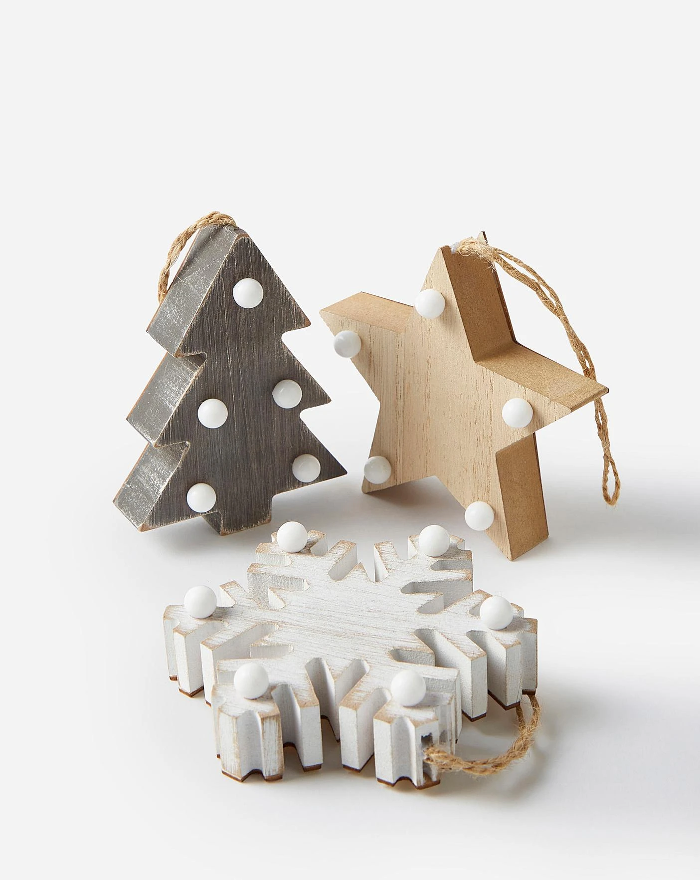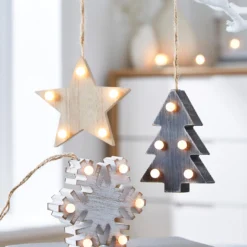 Light up your tree this christmas with this set of 3 Lit Hanging decorations. Battery operated (batteries not included). Indoor use only.