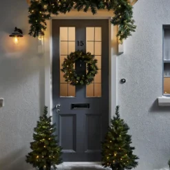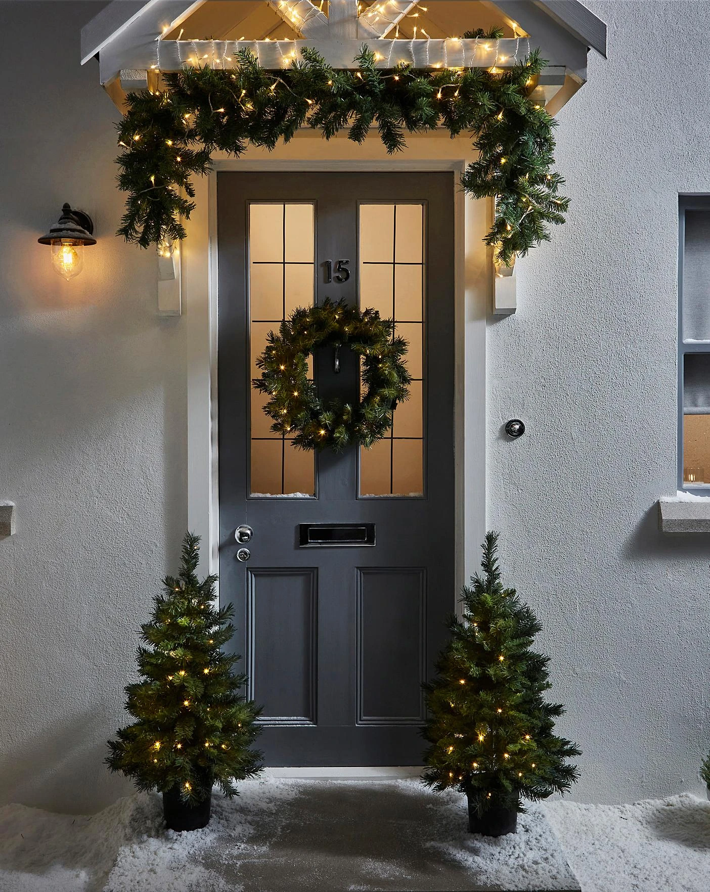 Malmo Lit outdoor decor set includes 2 potted pre-lit trees and a pre-lit wreath. All 3 pieces are made from mixed PVC branches and steel structure with battery operated warm white lights. Each piece requires 3aa batteries. Batteries not included. This set can be used both indoors and outdoors.