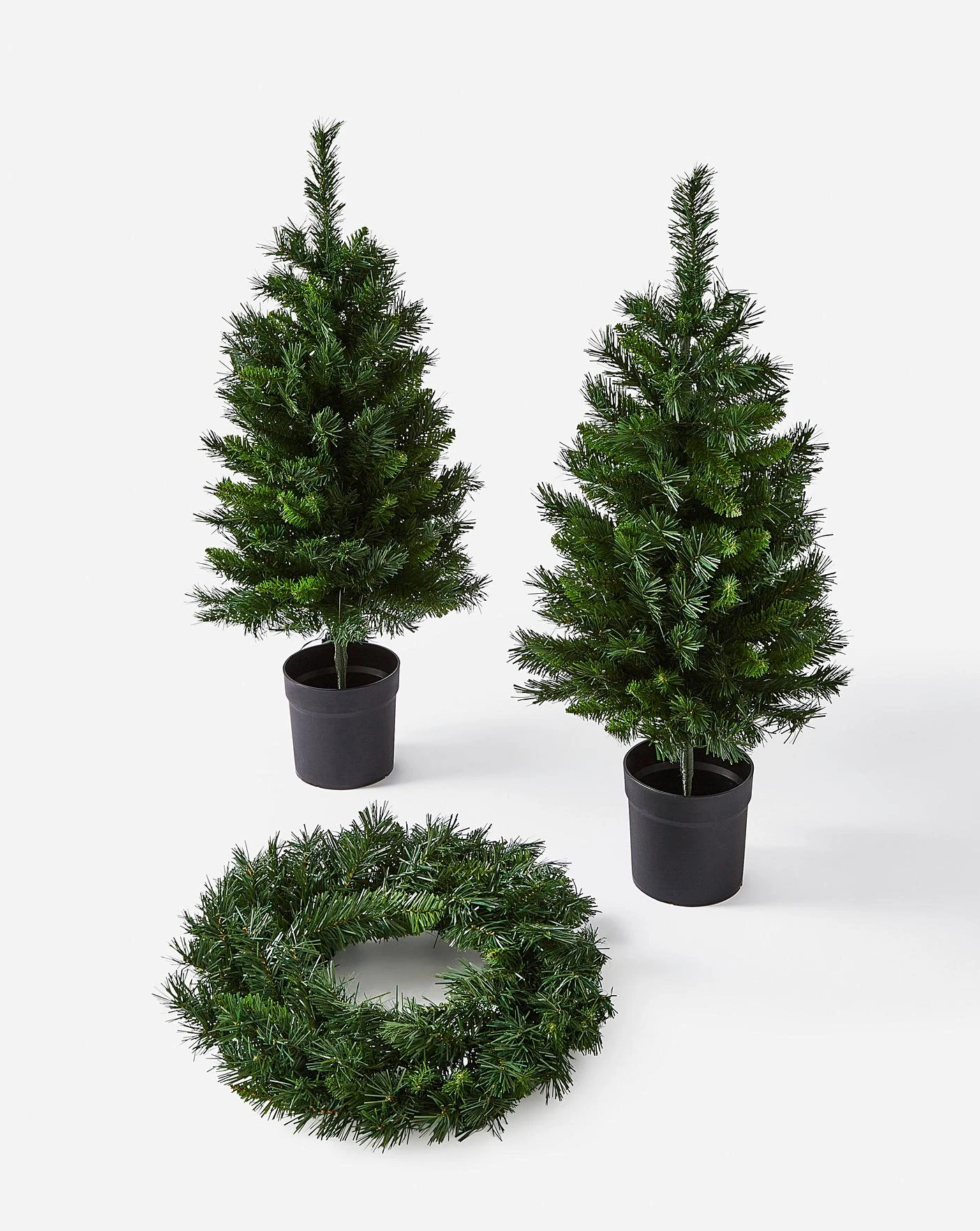 Product Dimensions: Each tree H90cm. Wreath H50cm x D50cm x W50cm. Total package weight: 3kg.