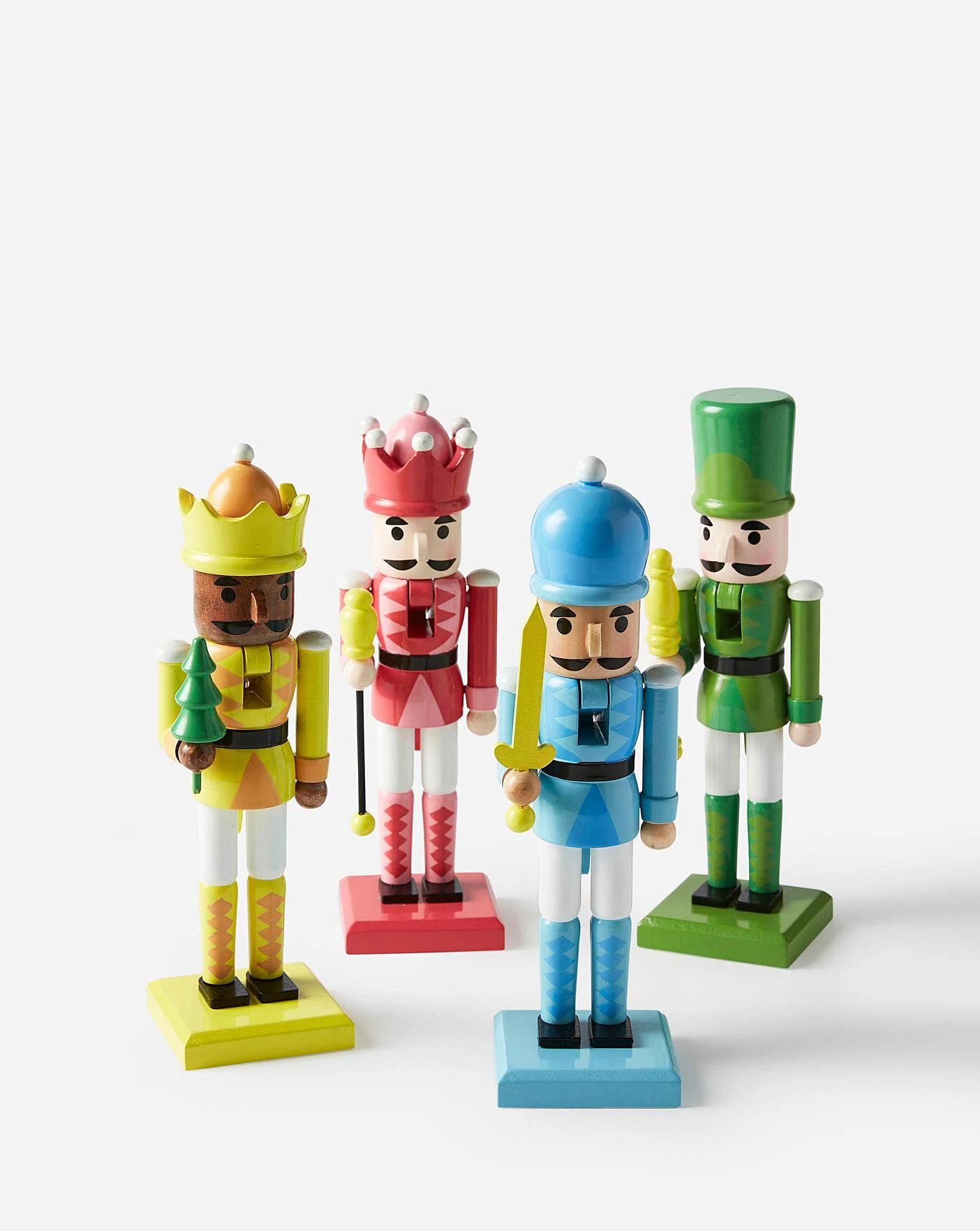 Set of 4 Merry and Bright Nutcrackers made of painted wood. Indoor use only. These are not toys and for decoration purposes only. Wipe clean with a soft dry cloth.