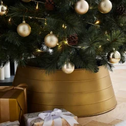 Ivyline metal Christmas tree skirt made from iron and measures H26cm x W72cm x D67cm. Rust resistant. Indoor use only. Wipe clean with a damp cloth.