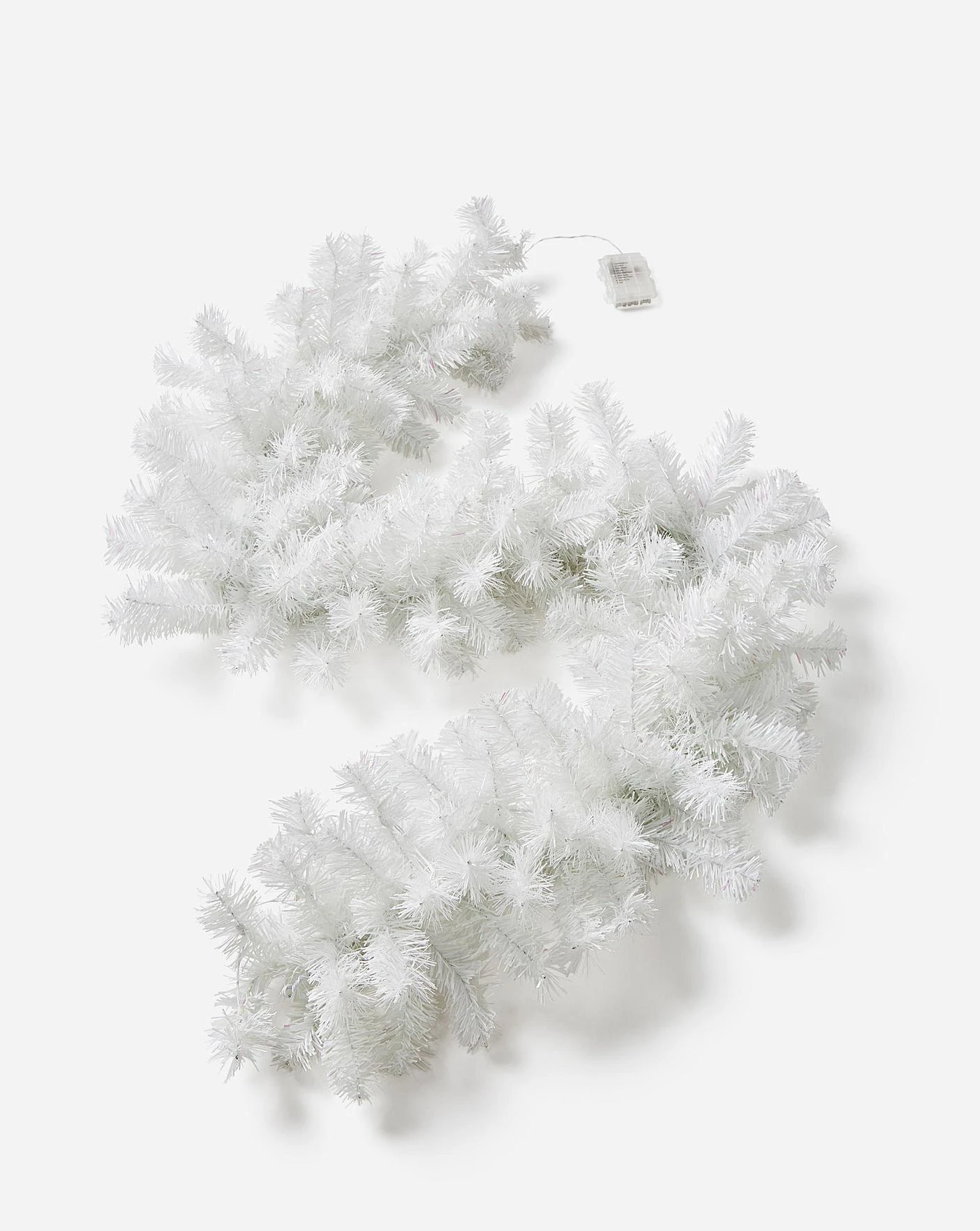 Montana white shimmer garland is pre lit with 50 battery operated warm white LED lights and 8 function settings. This is battery operated and requires X3 AA batteries (not included). This is made from PVC, mild steel and iridescent film and is for indoor use only.