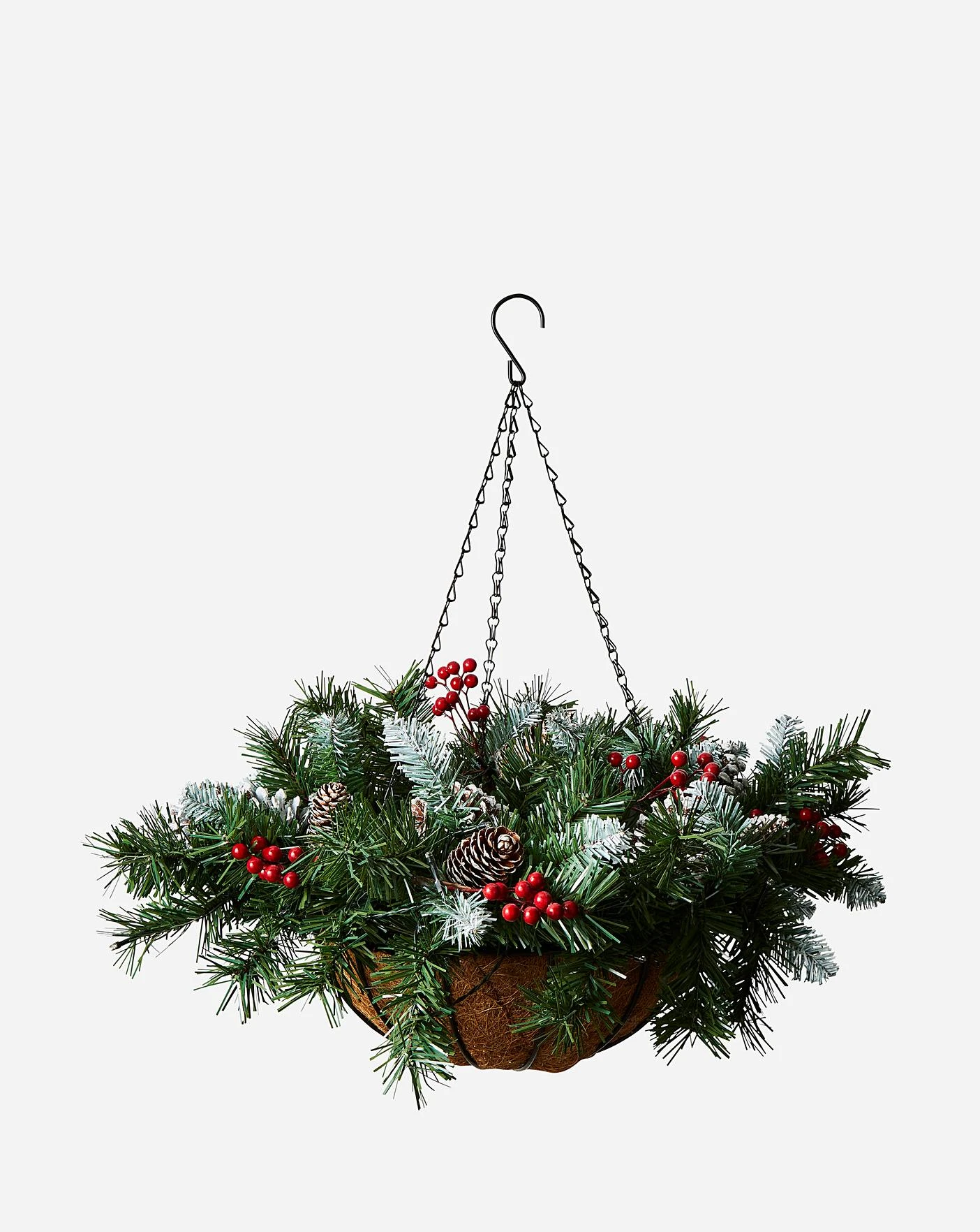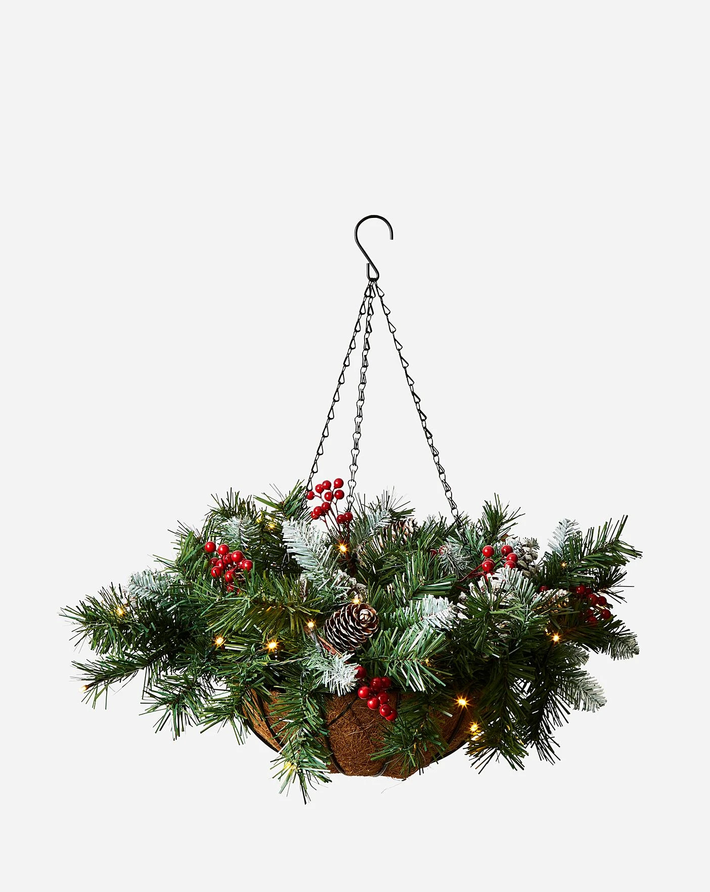 30cm diameter hanging basket with approx 60cm green New Jersey design snow tipped effect PVC /PE Tips and pre-decorated with Red Berries and Cones. Pre-Lit with battery operated 40 warm white LEDS. With On/Off and timer function. With approx 22cm hanging chains