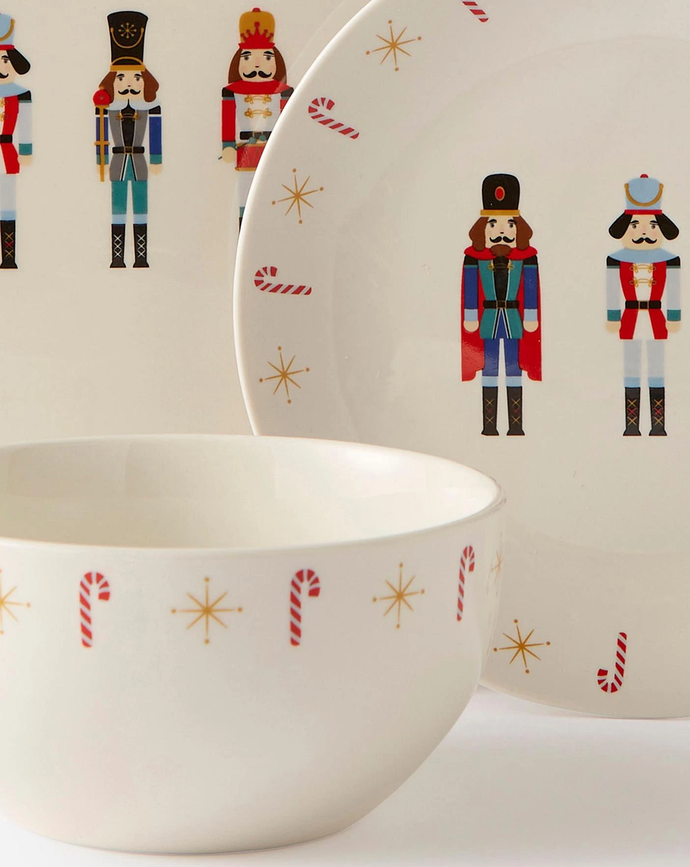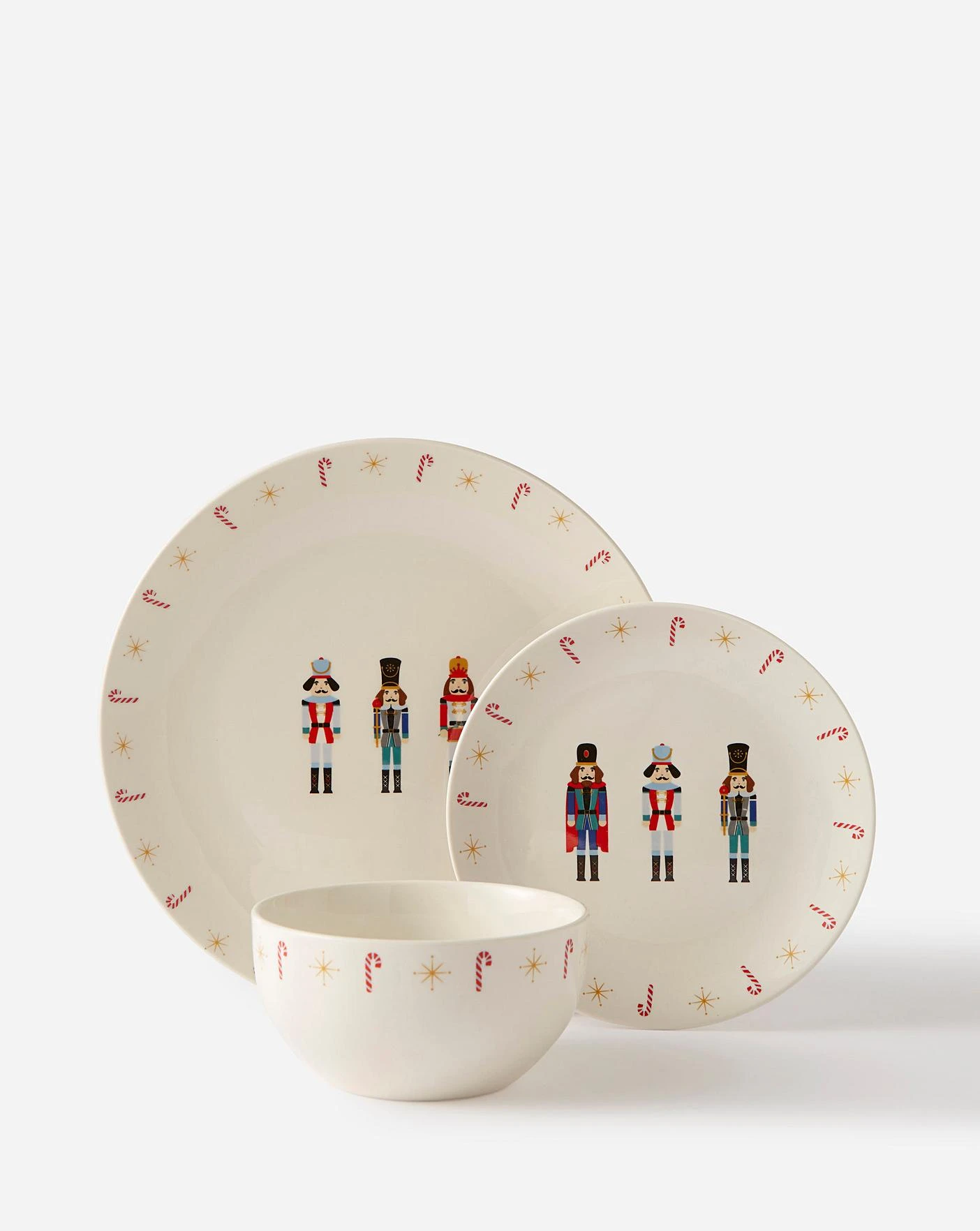 This 12pc dinner set consists of 4 dinner plate, 4 side plates and 4 bowls. Each piece is decorated with an exquisite traditional Nutcracker design. This is the perfect festive tabletop range. Part of a co-ordinating range other items are available. This dinnerware range is made from White porcelain and is dishwasher and microwave safe.