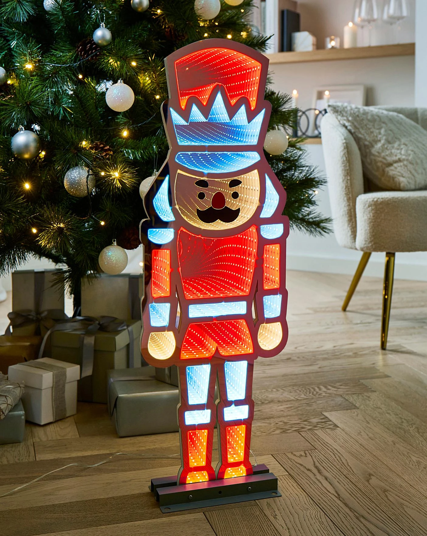 Nutcracker infinity light is suitable for indoor or outdoor use and is made of PVC with a built in LED light on a metal base. This is mains operated and has a 1 year manufacturer guarantee. This decoration has a tabbed film protective sheet on both sides. Please remove this. Wipe clean with a soft dry cloth. Full care leaflet provided.