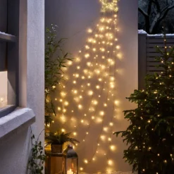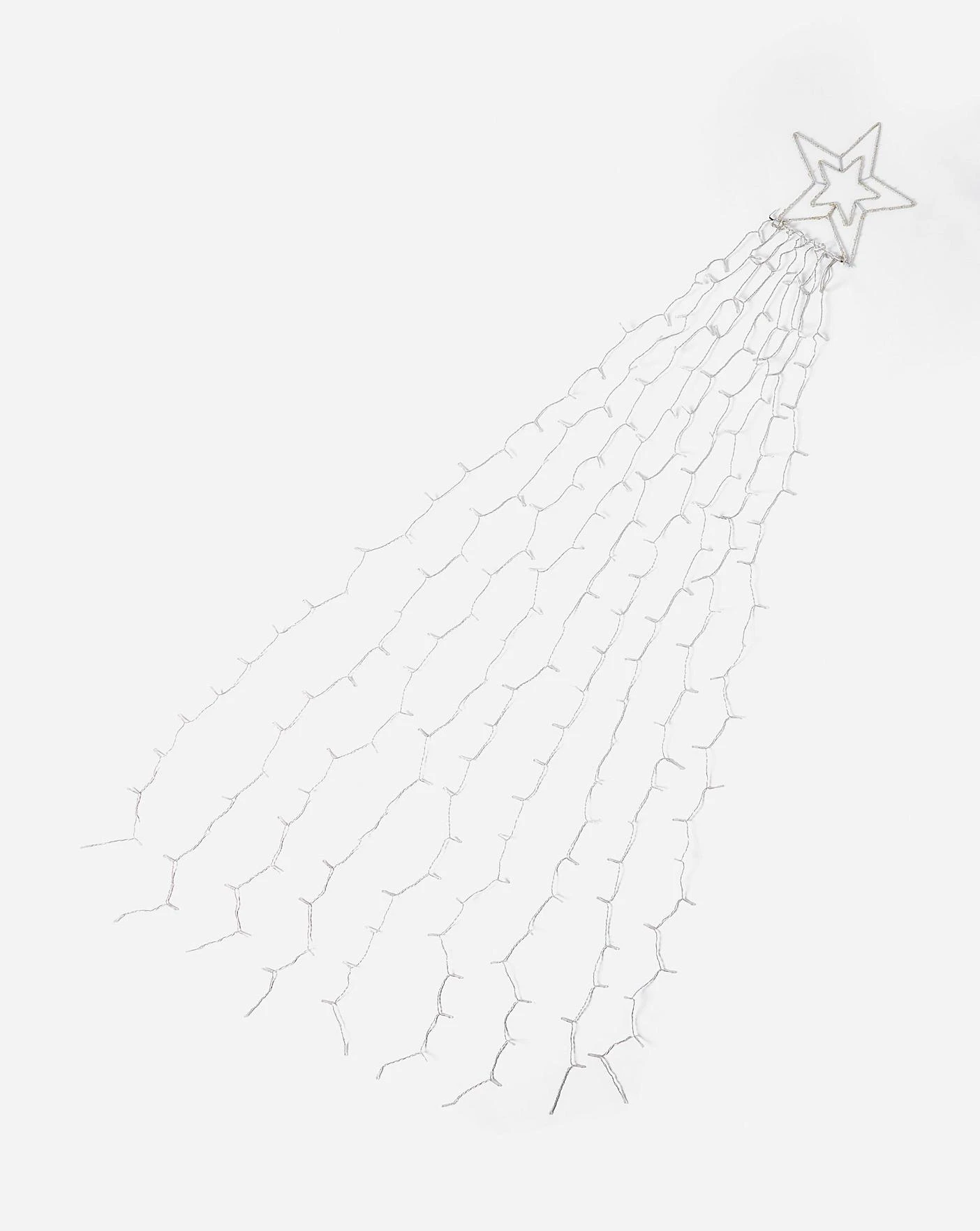 Shooting star curtain decoration has 247 warm white LED lights and 9 drops with 23 LEDS per drop and a 10cm spacing. 8 light functions ranging from flashing to static, this product is suitable for indoor and outdoor use. Mains operated with a 1 year manufacturer guarantee, full care leaflet provided. Wipe clean with a soft cloth.