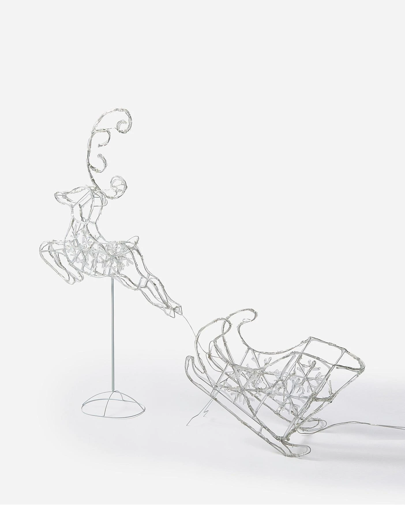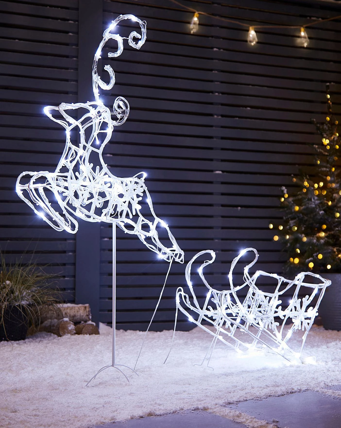 Twinkling soft acrylic reindeer and sleigh – product size reindeer 58 x 9 x 94 cm, sleigh 48 x 21 x 32cm. LED qty – 120 pcs white LED lead cable 5m, IP44 BS 31V 3.6W