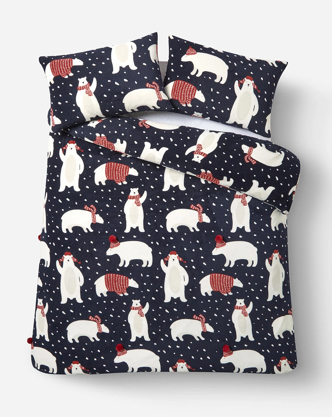 The Polar Bear Pom Pom Fleece bedding set features an accesorised polar bear motif repeat print with a contrast reverse. The set includes 2x pillowcases (1x single), 1x duvet cover.