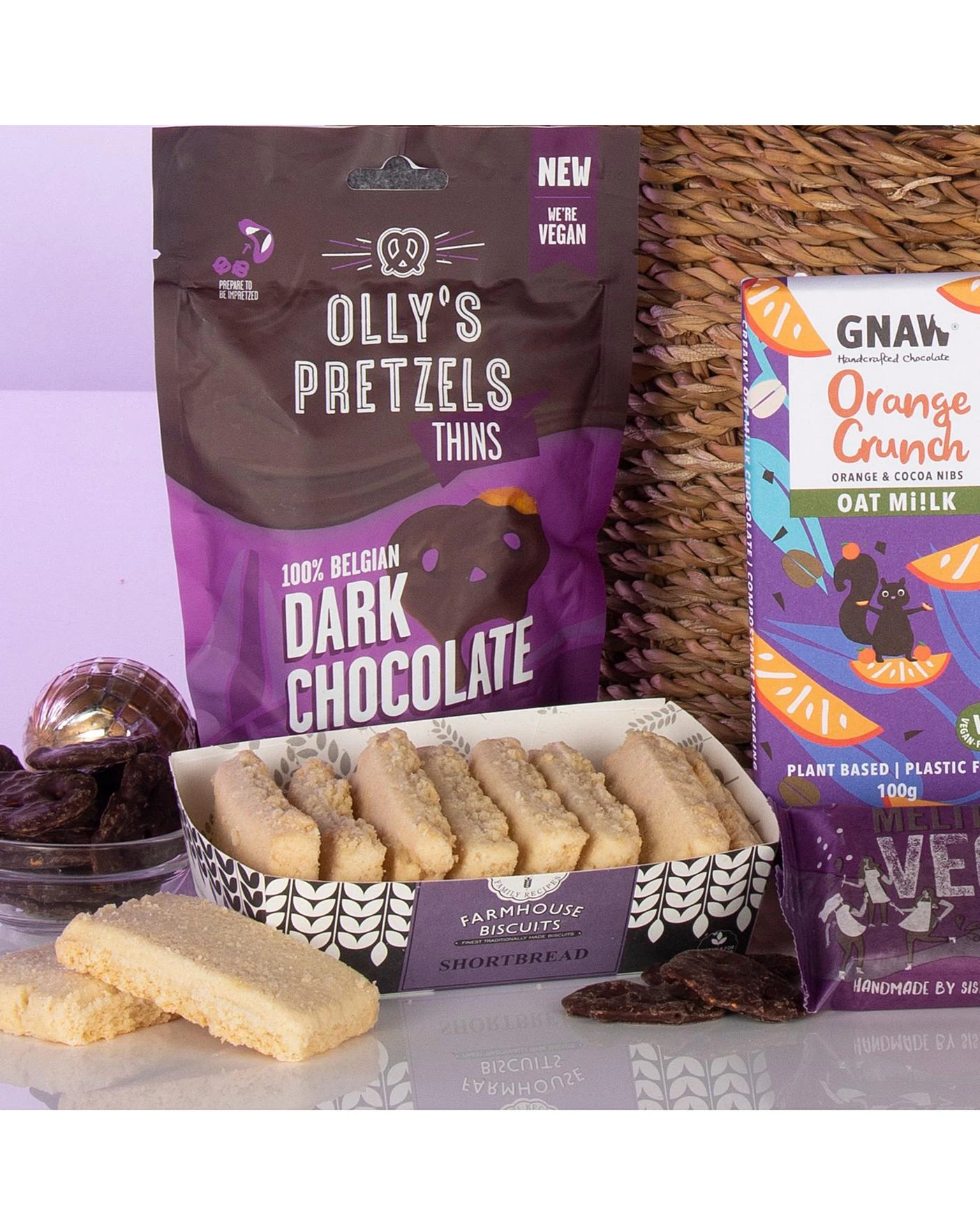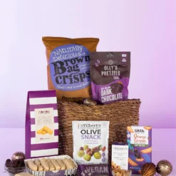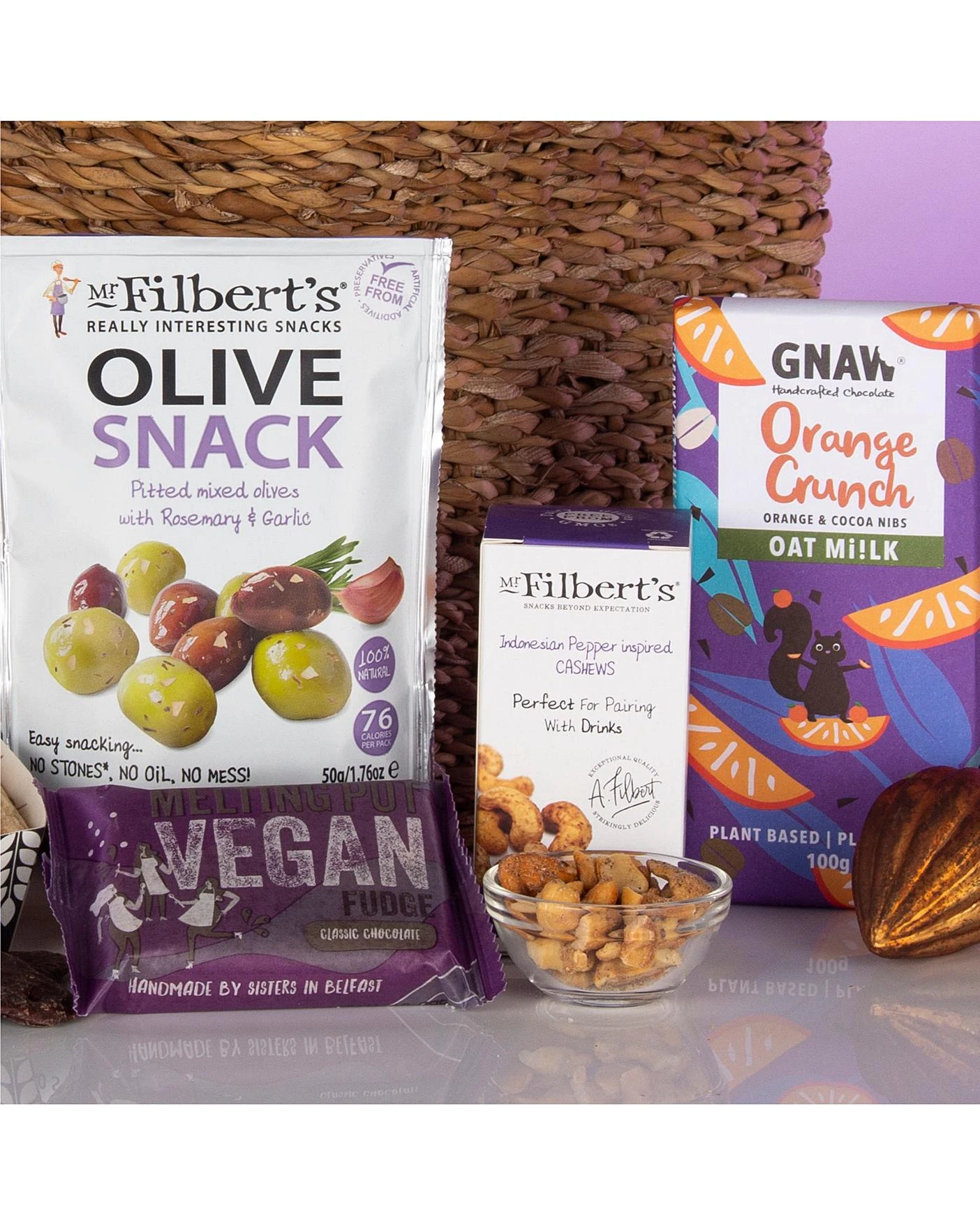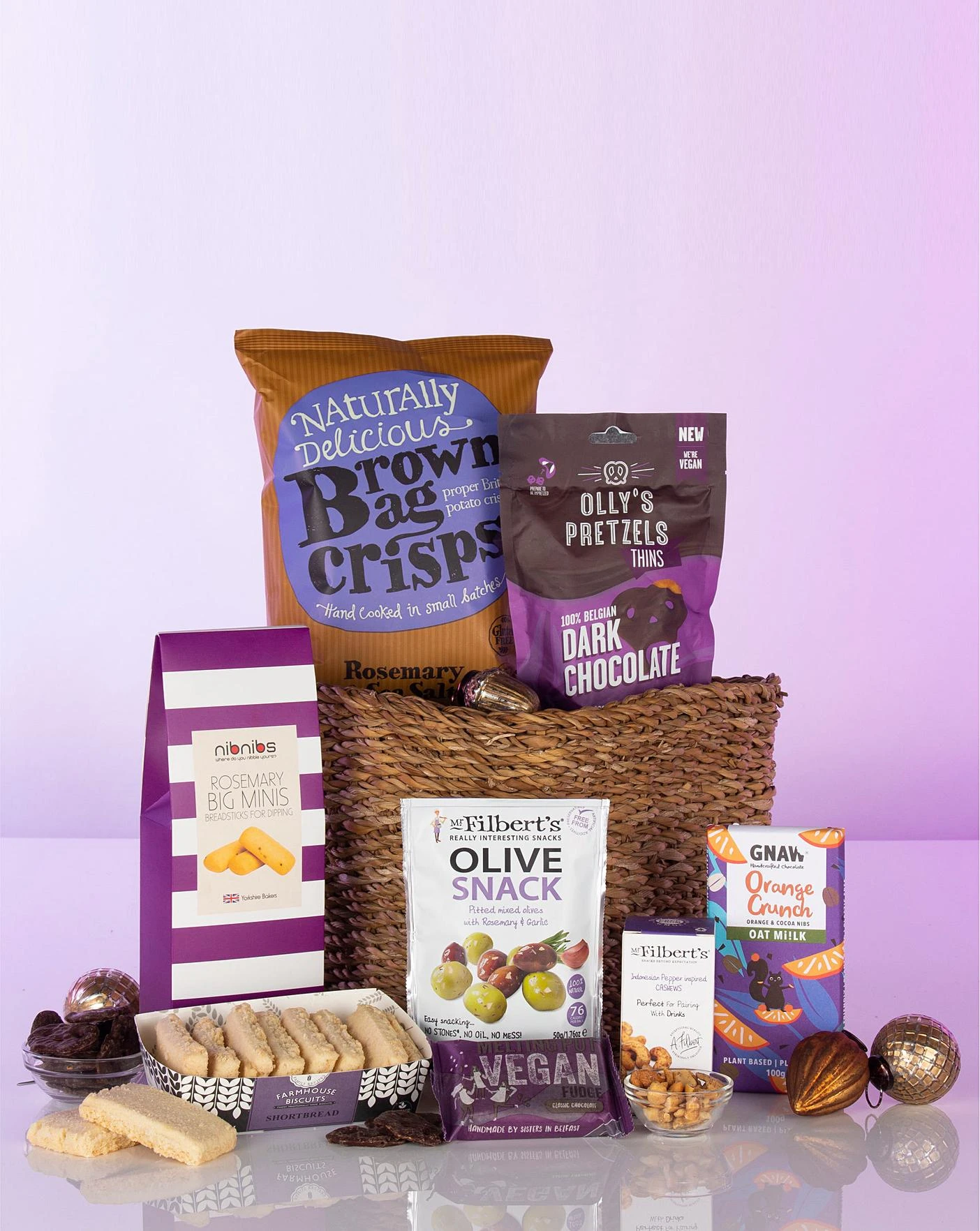 Contents: Brown Bag Rosemary & Sea Salt Crisps 150g, Farmhouse Biscuits Shortbread 200g, GNAW Orange Crunch Oat Mylk Bar 100g, Melting Pot Vegan Classic Chocolate Fudge 90g, Mr Filbert’s Indonesian Pepper Inspired Cashews 35g, Mr Filbert’s Rosemary & Garlic Olives 50g, nibnibs Rosemary Big Minis Breadsticks for Dipping 100g, Olly’s Salted Dark Chocolate Thins 90g, Seagrass Storage Cube.