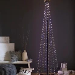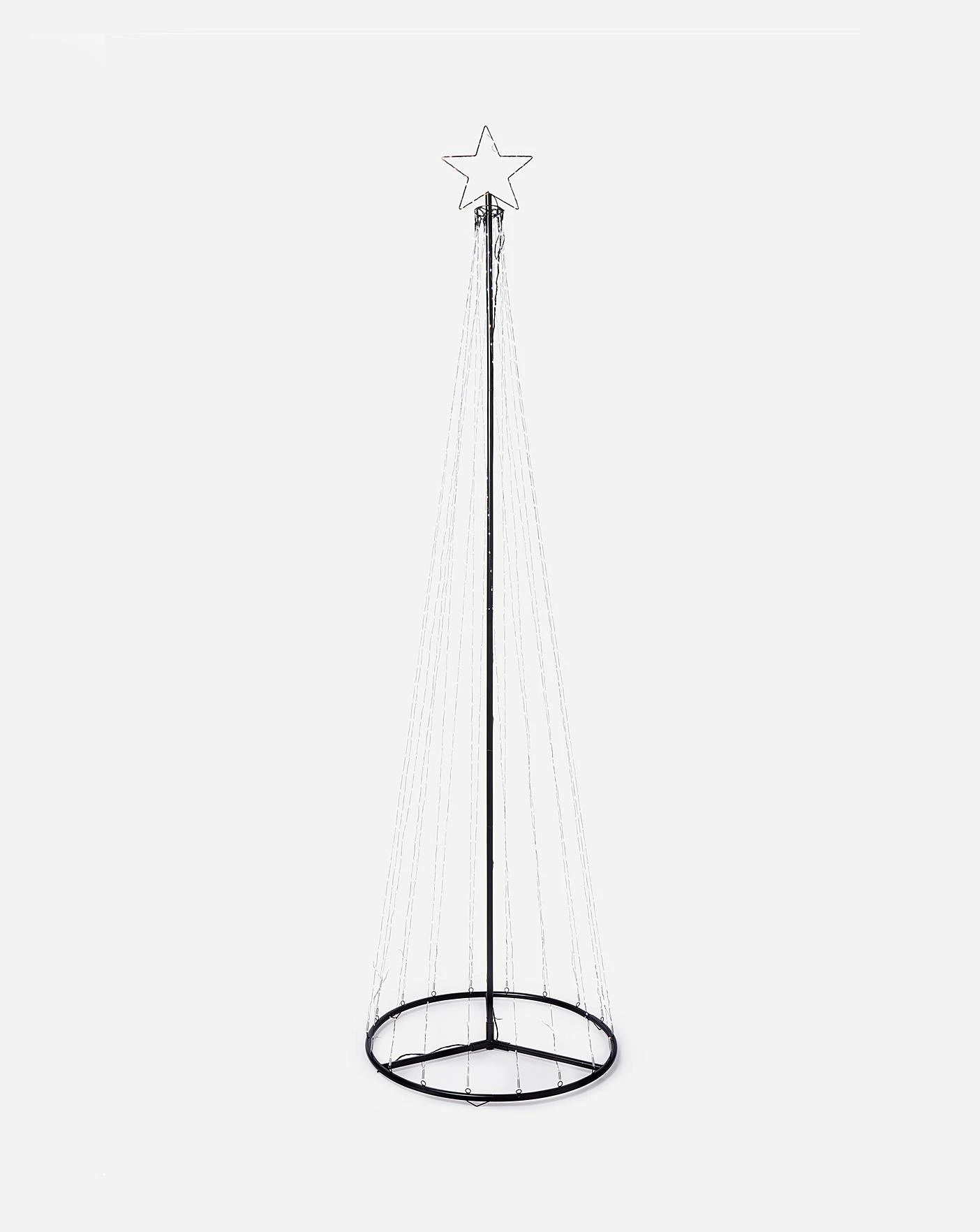 210 CM Tall pyramid tree with pinwire LED lights and star topper. Easy to assemble, hanging each of the 15 pinwire threads down to fix to the tubular frame base. With a total of 595 Warm White and White LEDs offering multi action light functions including static. 10 M cable suitable for indoor or outdoor use.