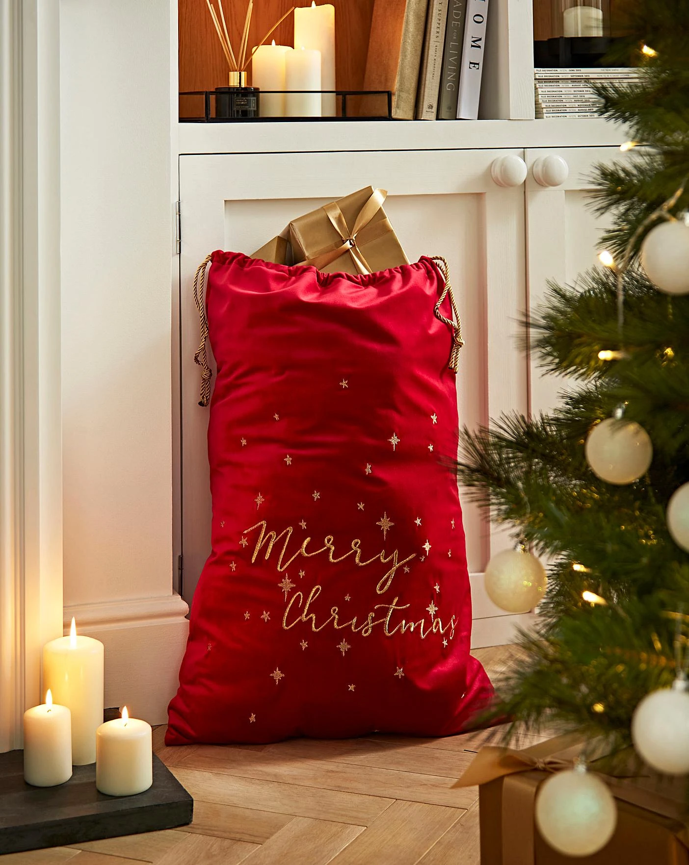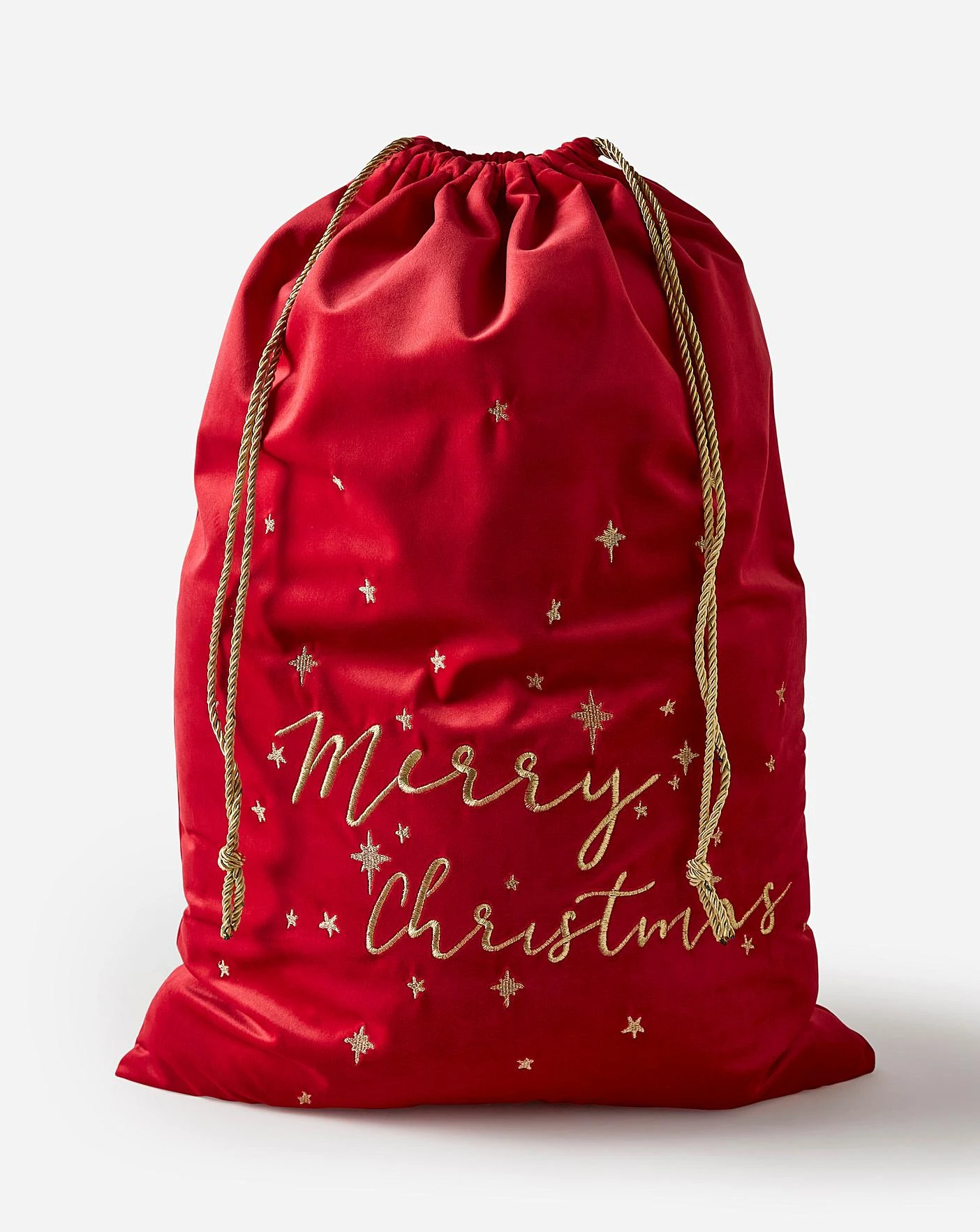 Red present sack made out of 100% polyester velvet. This product can be machine washed at 30 and can be tumble dried at a low temperature. 1 year manufacturer guarantee included.