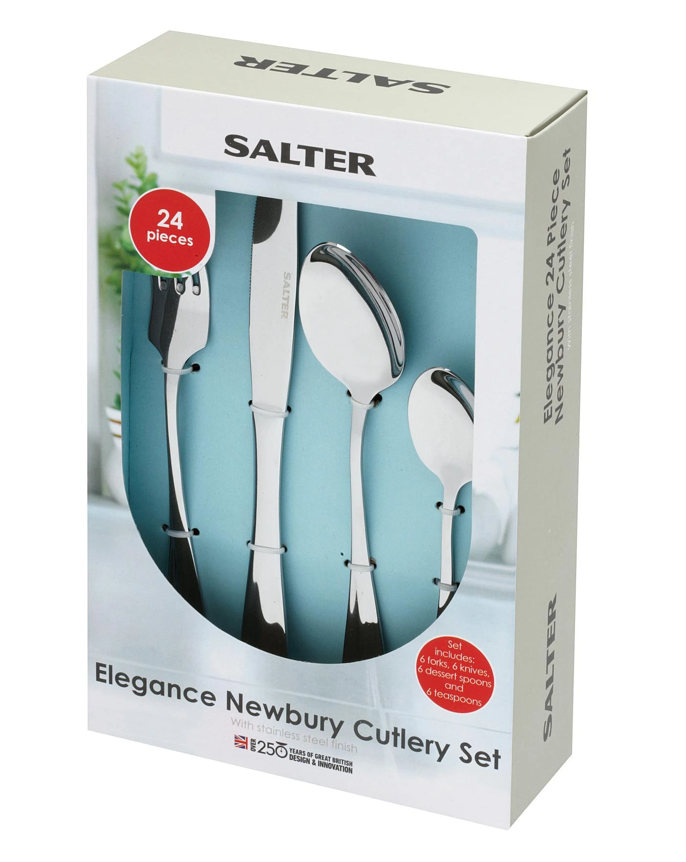 Whether you are starting a collection for a new home or replacing your existing cutlery, this Newbury set is a great way to begin. Make your table more appealing with this luxurious Salter Newbury cutlery, inspired by elegant British dining. Ideal as a starter set or for refreshing your dinnerware, this 24-piece set contains 6 knives, 6 forks, 6 tablespoons and 6 teaspoons made from mirror polished stainless steel, which is guaranteed to impress your guests. Made from high-quality stainless steel, this Elegance cutlery set is durable, strong and designed to enhance your dining experience. Practical and durable, this set is perfect for everyday use, while the gorgeous, classic style is sure to give your existing tableware a graceful new look. With a timeless look, this beautiful cutlery will match most tableware schemes, and will continue to last as fashions change. Finely balanced with a pleasant weight, this cutlery is delightful to hold and use, fitting nicely in the hand.