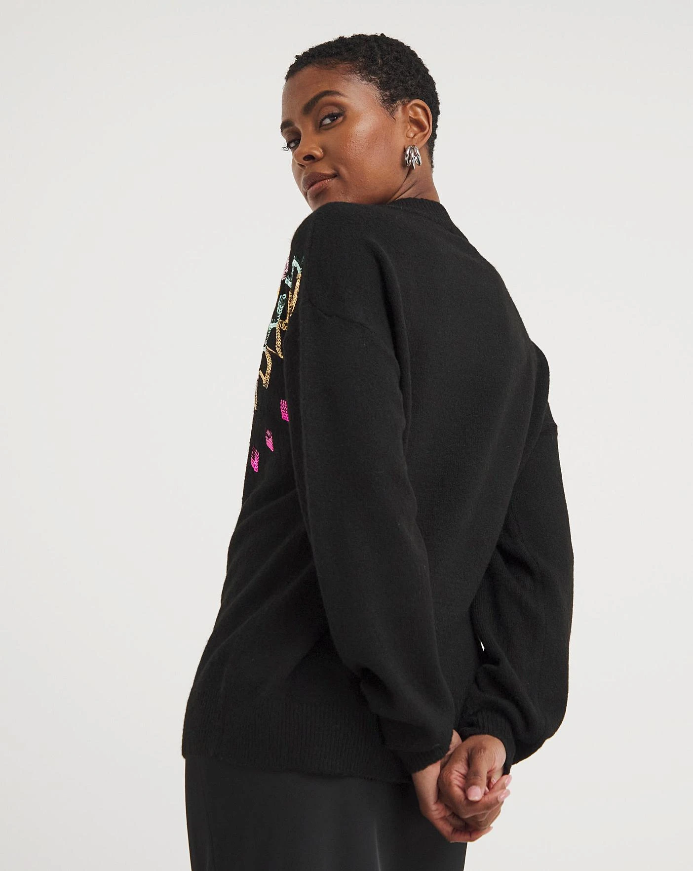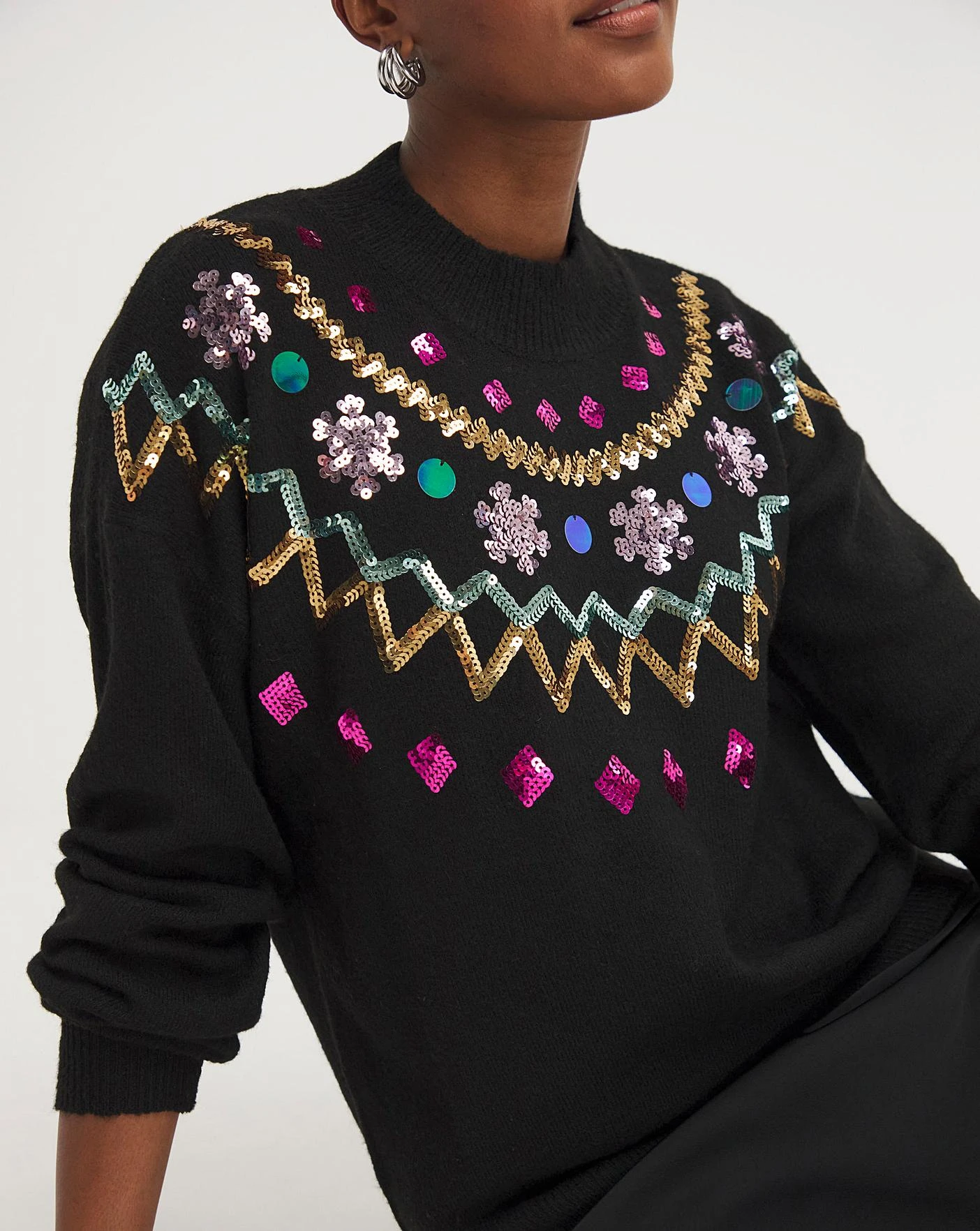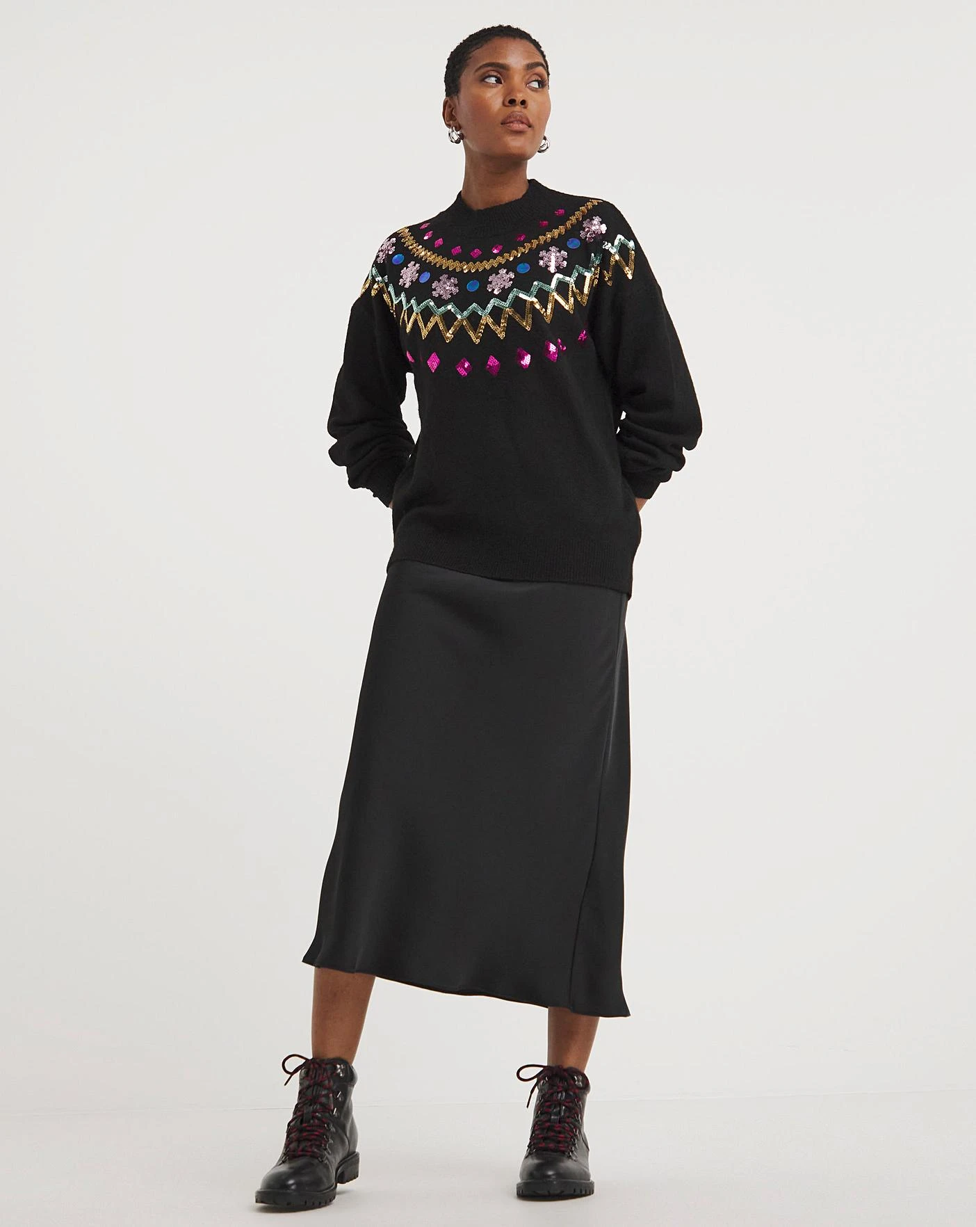 A wardrobe essential throughout December, wrap up in this Sequin Novelty Fairisle Jumper. Featuring long sleeves and an decorative fairisle pattern. Pair with jeans and boots.