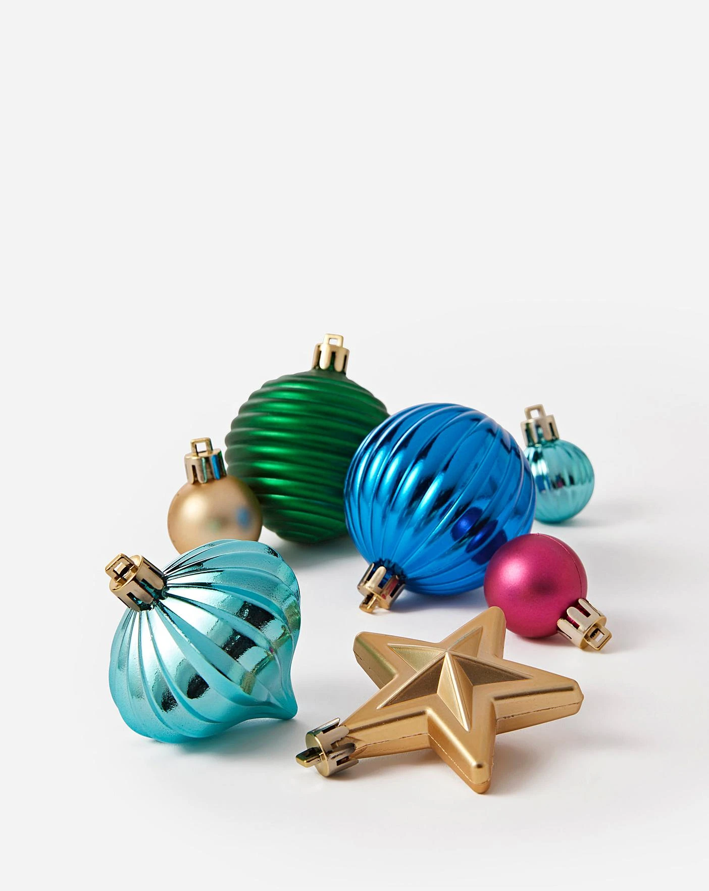30 pack of design shatterproof baubles in a multi mixed colourway. 15 larger design baubles, 9 mini baubles and 6 stars. This set is shatterproof. Indoor use only and wipe clean with a soft dry cloth. This set will be packed in a mail order box with each bauble tissue paper wrapped to protect during