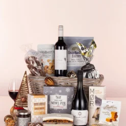 Contents: Bianco Vino Frizzante NV Alessandro Gallici Italy 75cl 11% vol, Butlers Vanilla Fudge 125g, Crunch & Crumble Chocolate Orange Biscuits 150g, Fairfields Farm Sea Salt & Black Pepper Crisps 150g, Rouge Pays d’Oc La Voile France 75cl 13% vol, Linden Lady Milk Chocolate Covered Marshmallows 125g, Maxwell & Franks 4 Mince Pies, Maxwell & Franks Christmas Pudding 350g, Maxwell & Franks Iced Fruit Cake 350g, MOR Cornmeal and Poppy Seed Snap Crackers 115g, Mr Filbert’s Indonesian Pepper Cashews 100g, Orchard Preserves Farmhouse Chutney 200g, Stas Decorative Milk Chocolate Lolly 100g, Whitewash Kubu Storage Basket.