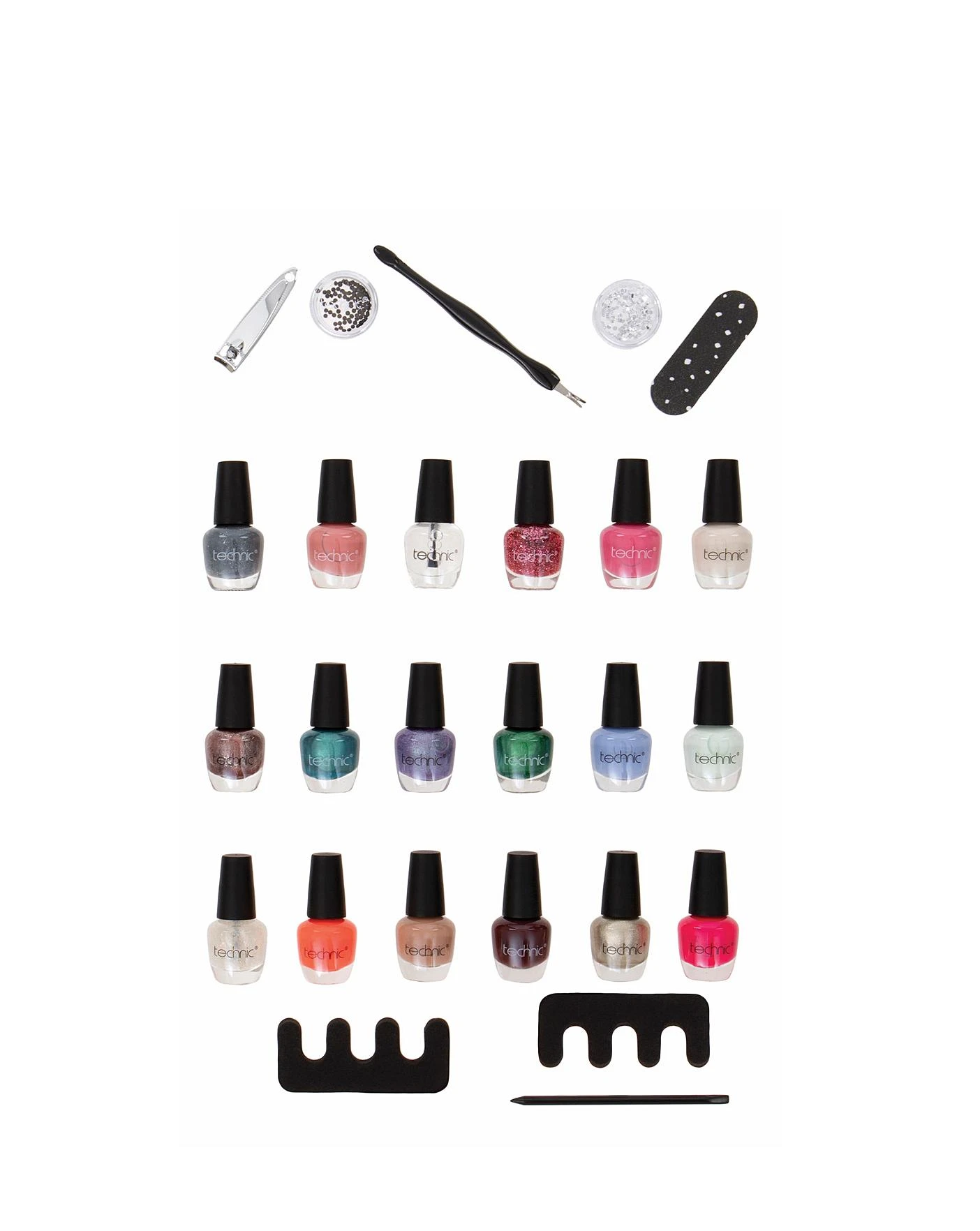 Includes: 18 x Nail Varnishes 2 x Toe Separators 1 x Nail Clippers 1 x Nail File 1 x Pot Silver Nail Gems 1 x Pot Coloured Nail Gems1 x Orange Stick 1 x Cuticle Pusher