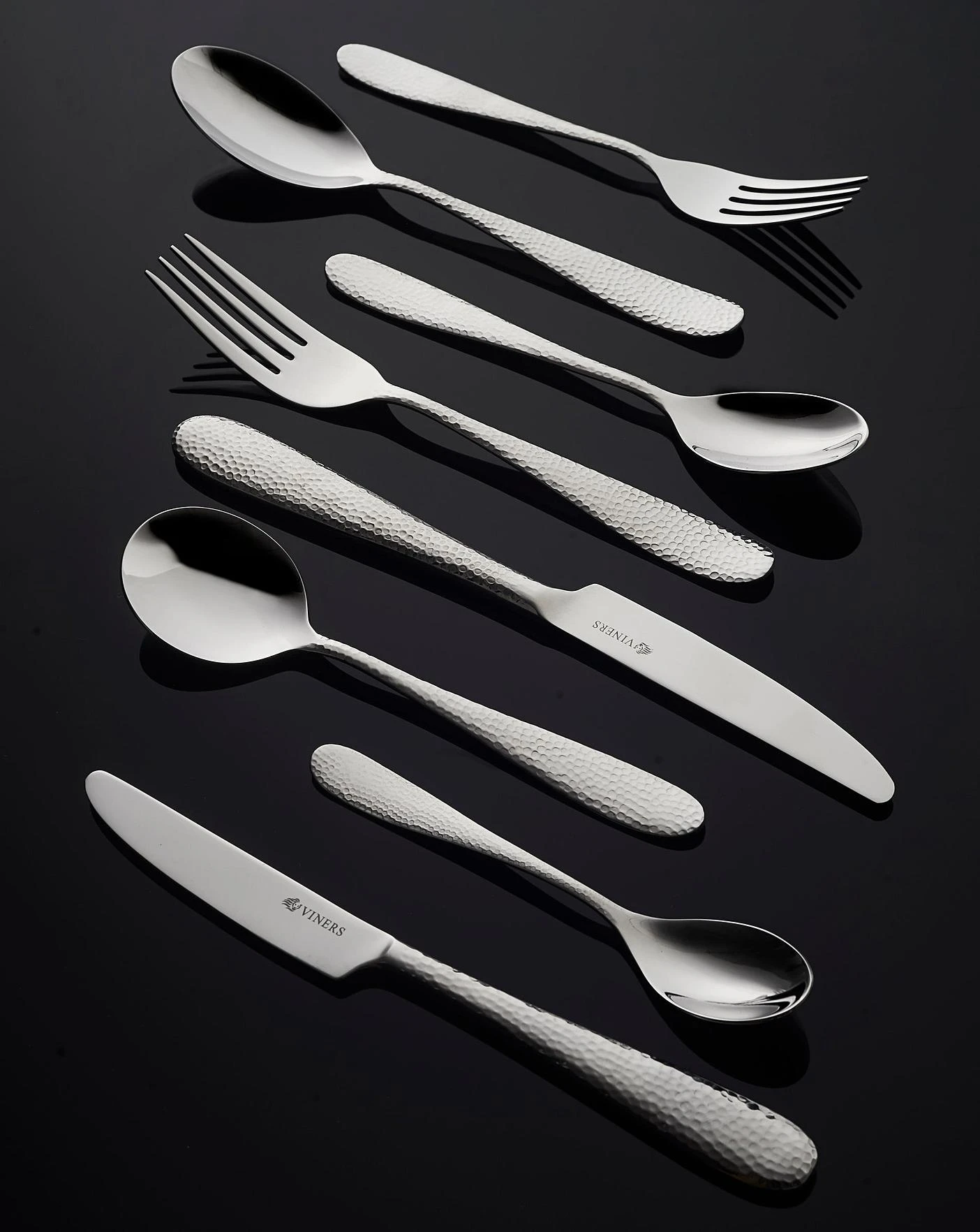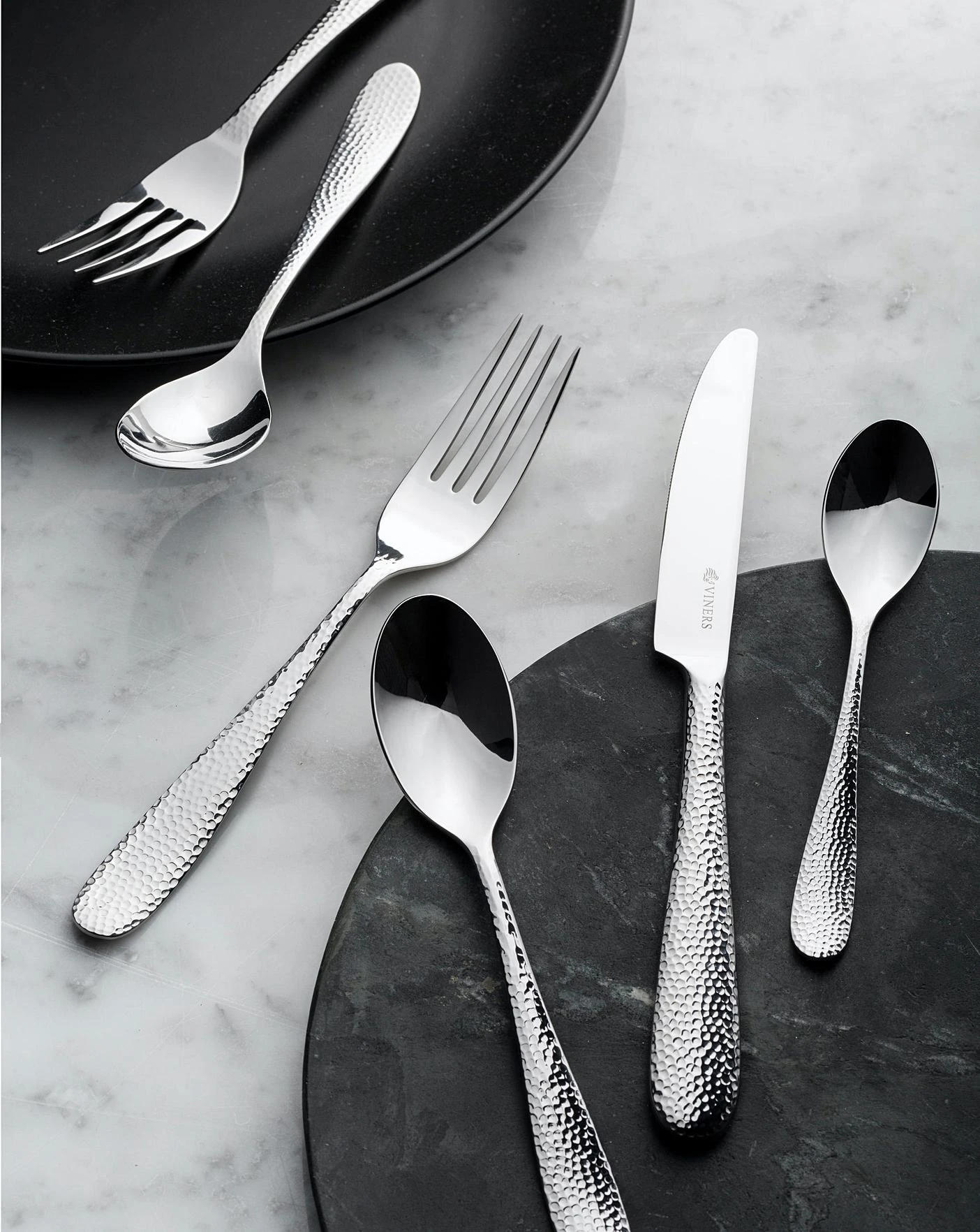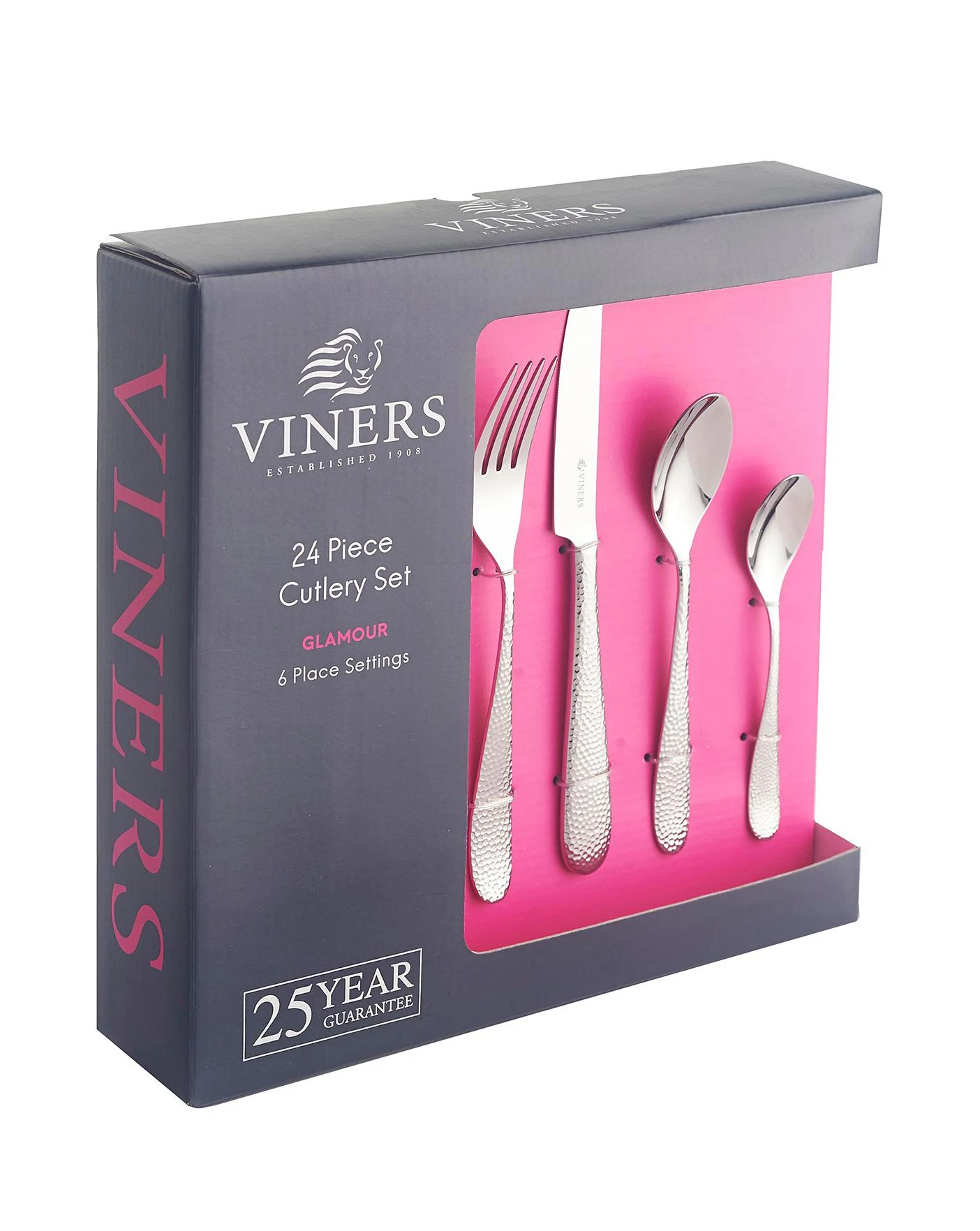 This cutlery set is enviably glamorous with a hammered texture that creates an ethereal shimmering effect on the handles. The 24 piece set has classic lines with teardrop shape handles and the mirror polish finish. Add that dazzling finishing touch to any table setting with the Glamour collection. This set is perfect for everyday use and when entertaining guests. The set includes 6 x table knives, 6 x table forks, 6 x tea spoons and 6 x dessert spoons. Made from the finest 18/0 quality steel, our cutlery is polished to a lustrous mirror finish. The set is hard wearing, resistant to rust and can be put in the dishwasher. These sets will serve you for a lifetime. This collection has that special glamorous texture on the handles that sets it apart from other cutlery. Packaged in a beautiful gift box. Over 110 years ago the Viners brand was first created and has become a much-loved household name, steeped in British heritage. We pride ourselves on delivering excellence – elegant, robust cutlery that comes with a 25 year guarantee.