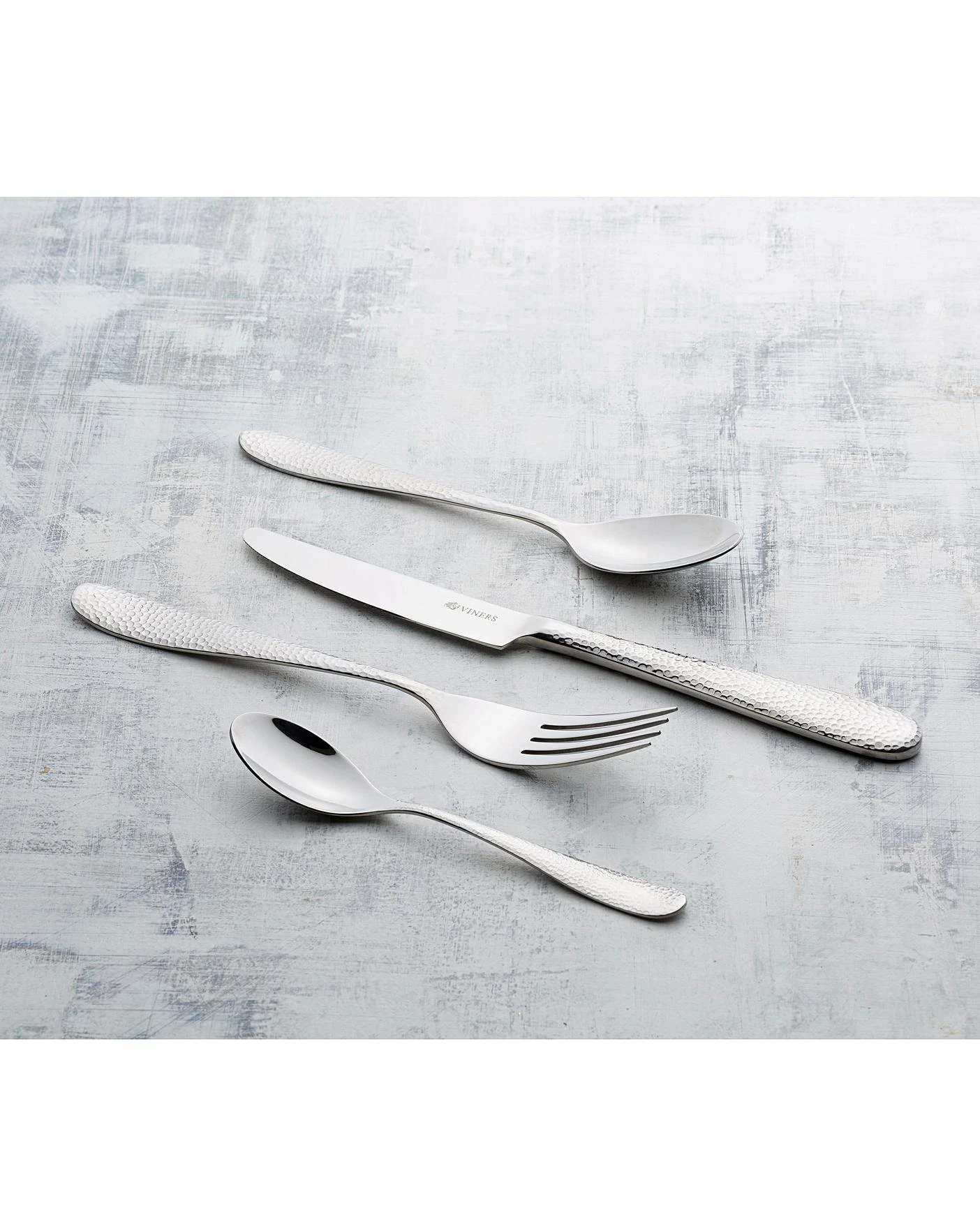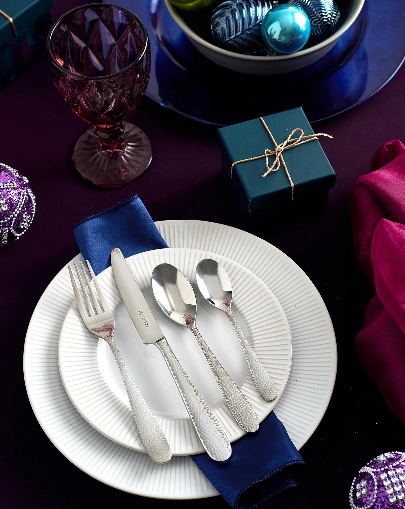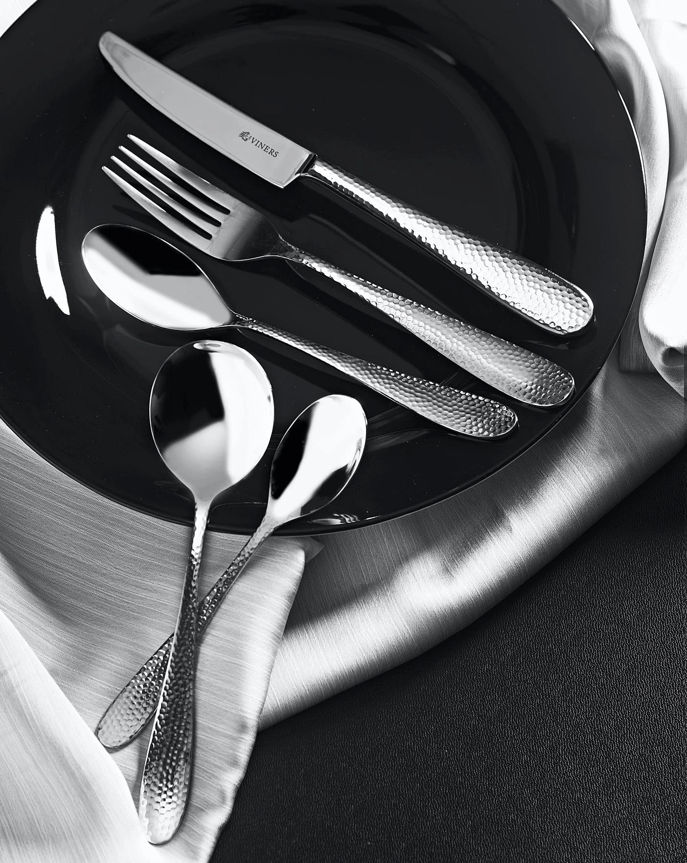 This cutlery set is enviably glamorous with a hammered texture that creates an ethereal shimmering effect on the handles. The 24 piece set has classic lines with teardrop shape handles and the mirror polish finish. Add that dazzling finishing touch to any table setting with the Glamour collection. This set is perfect for everyday use and when entertaining guests. The set includes 6 x table knives, 6 x table forks, 6 x tea spoons and 6 x dessert spoons. Made from the finest 18/0 quality steel, our cutlery is polished to a lustrous mirror finish. The set is hard wearing, resistant to rust and can be put in the dishwasher. These sets will serve you for a lifetime. This collection has that special glamorous texture on the handles that sets it apart from other cutlery. Packaged in a beautiful gift box. Over 110 years ago the Viners brand was first created and has become a much-loved household name, steeped in British heritage. We pride ourselves on delivering excellence – elegant, robust cutlery that comes with a 25 year guarantee.
