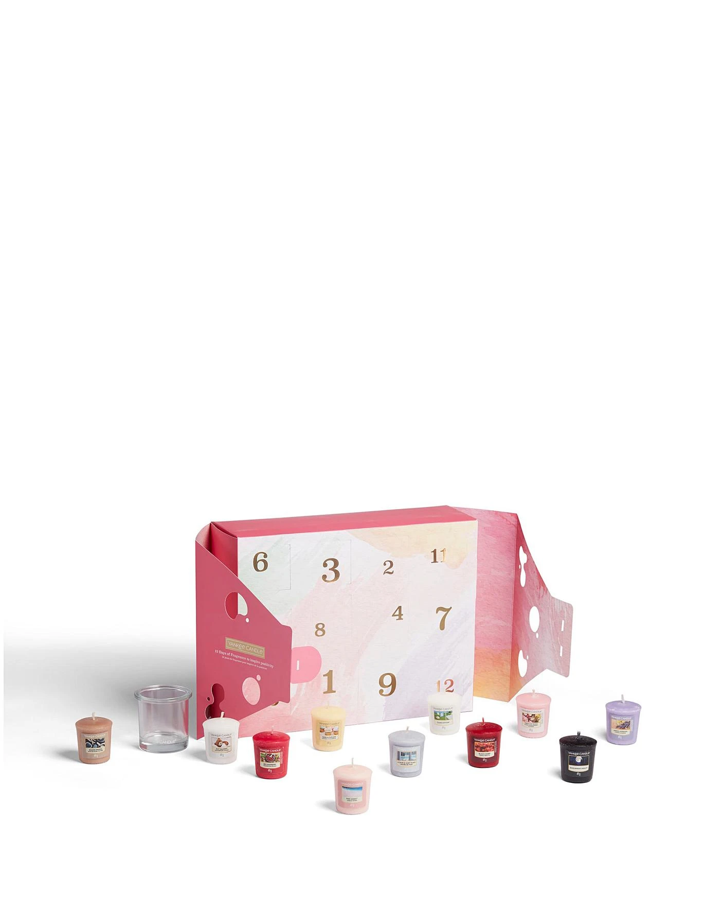 Contains: 1 Original Votive Candle of each fragrance, Clean Cotton, Black Cherry, Red Raspberry, Midsummers Night, Vanilla Cupcake, Lemon Lavender, Pink Sands, Soft Blanket, Fresh Cut Roses, Seaside Woods, Vanilla Lime, A Calm & Quiet Place, 1x Coral POP Votive Holder.